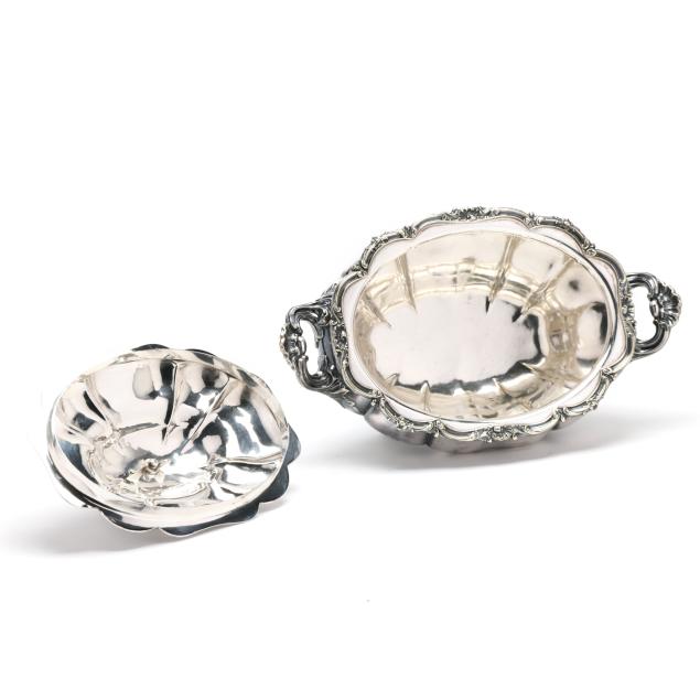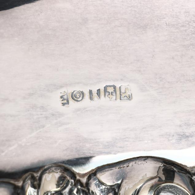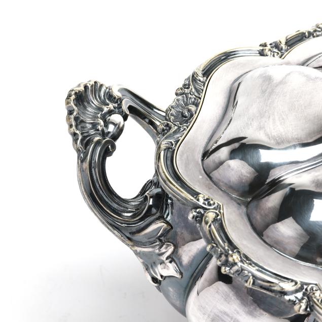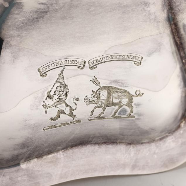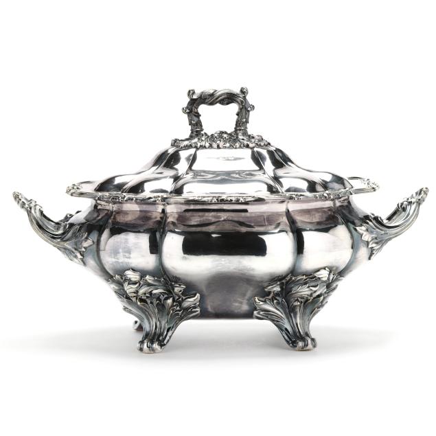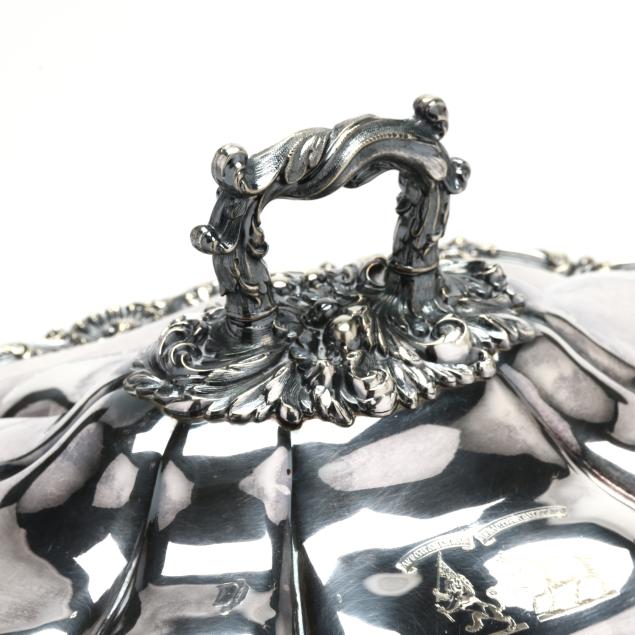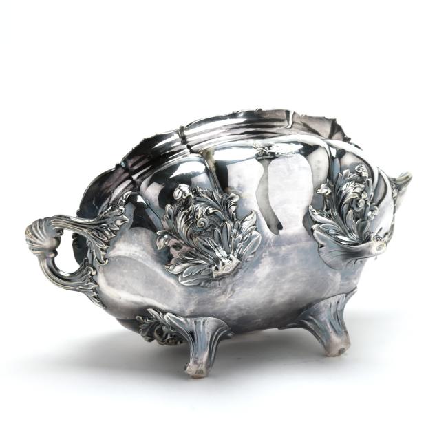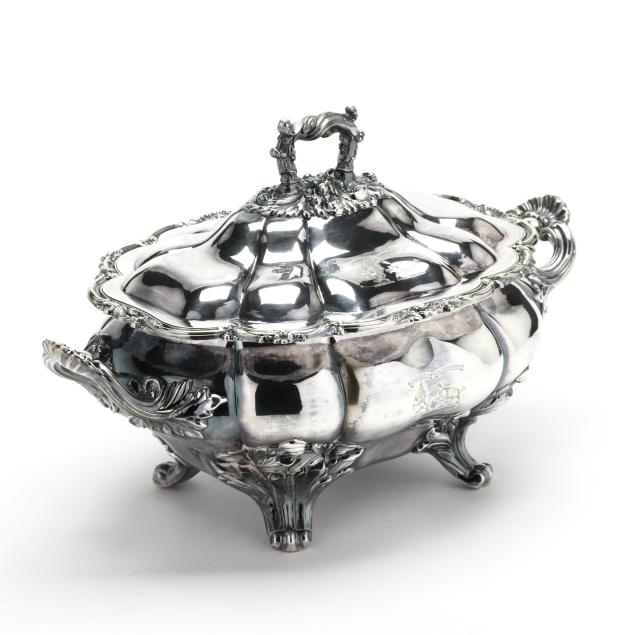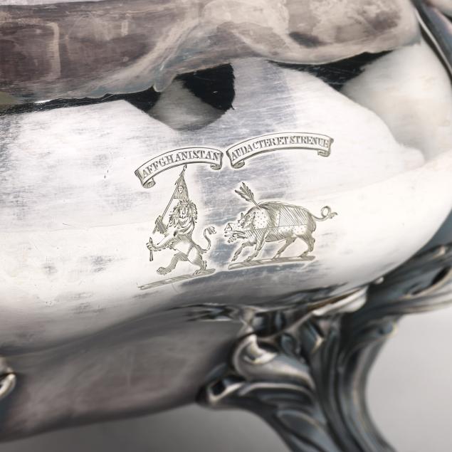 Birmingham, 19th century, a lobed form with foliate and rocaille decoration to the rims, handles, and feet, featuring the engraved armorial monogram of the Montague-Polluck family coat of arms "Affghanistan Audacter Et Strenue" to the lid and base.