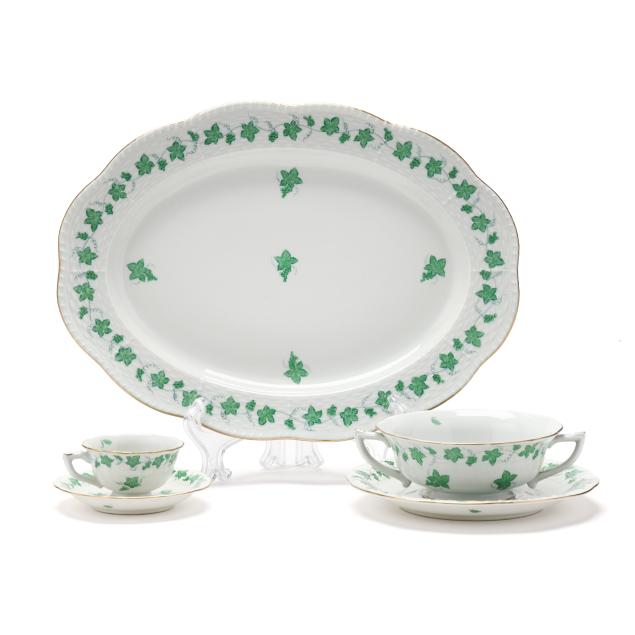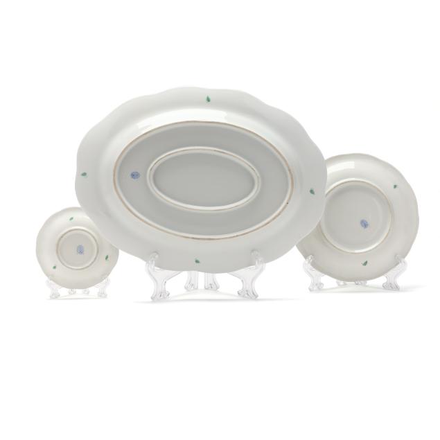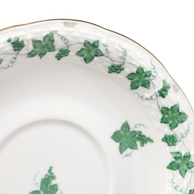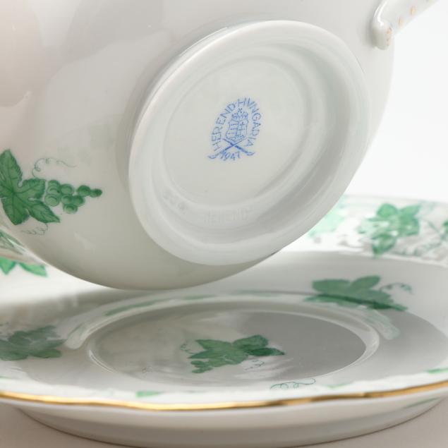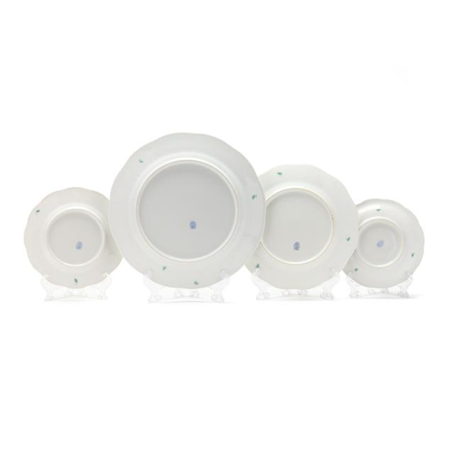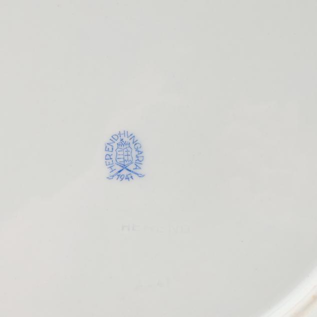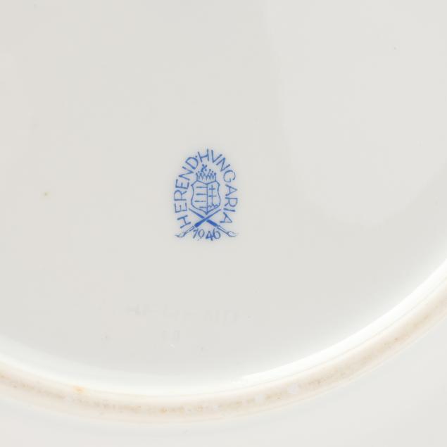 (102) pieces, Hungary, hand-painted and gilt porcelain, to include an oval serving platter (13 5/8 in.); (12) dinner plates (10 1/8 in.); (12) salad/dessert plates (8 1/8 in.); (12) bread and butter plates (6 1/2 in.); (11) footed cream soup bowls (6 1/2 in.) and (12) saucers (7 1/8 in.); (10) footed cups (2 in.) and (12) saucers (5 7/8 in.); and (10) footed demitasse cups (1 5/8 in.) and (10) saucers (4 1/2 in.). All with 1946-7 company backstamps to the underside.