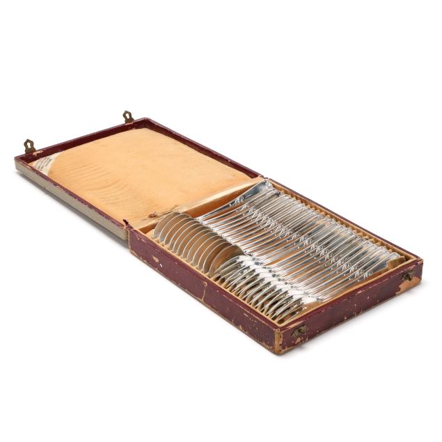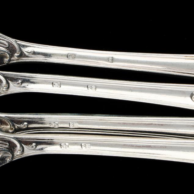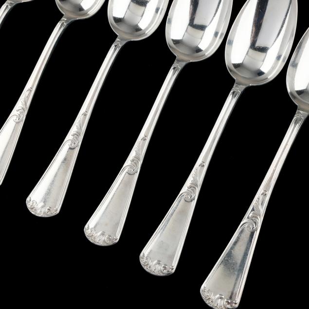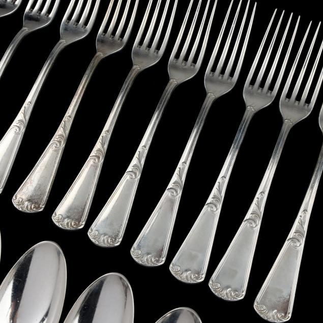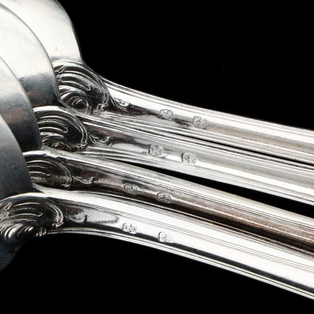 .800 silver, circa 1942 to 1990, each stamped with "A/800" and "VA" maker's mark, includes (12) oval bowl spoons and (12) forks, presented in the original fitted case, retailed by M. A. Hubert & Cie, Brussels, monogrammed.