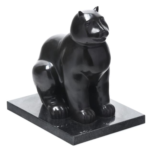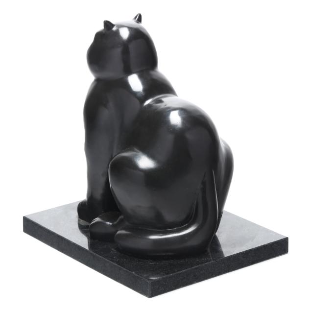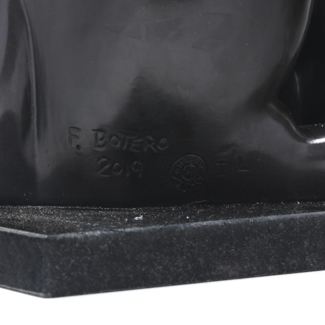 Patinated bronze, signed and dated "F. BOTERO / 2019," with impressed "Fonderia M Italy" foundry mark and numbered "I/L" to rear leg, mounted to a rectangular stone base.