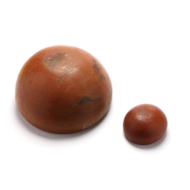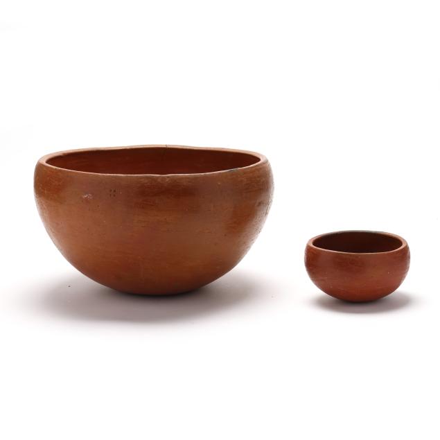 Mid-20th century, hand-coiled and pit-fired terracotta, each vessel "signed" with four shallow circular impressions to body.