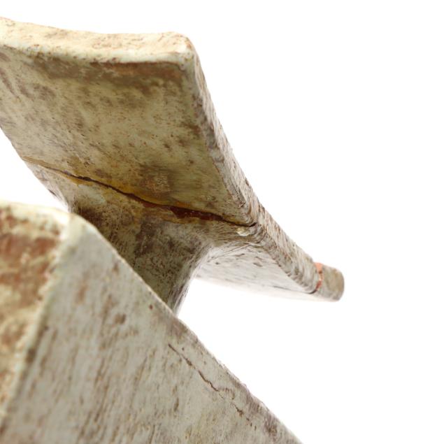 A few breaks and old repairs with associated adhesive residue and a chip to top.