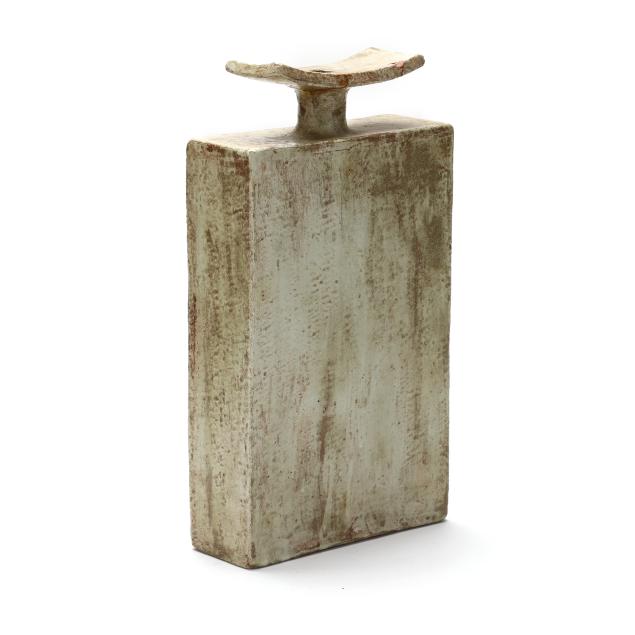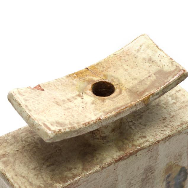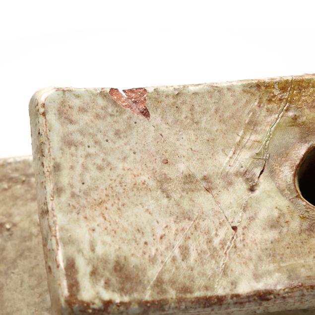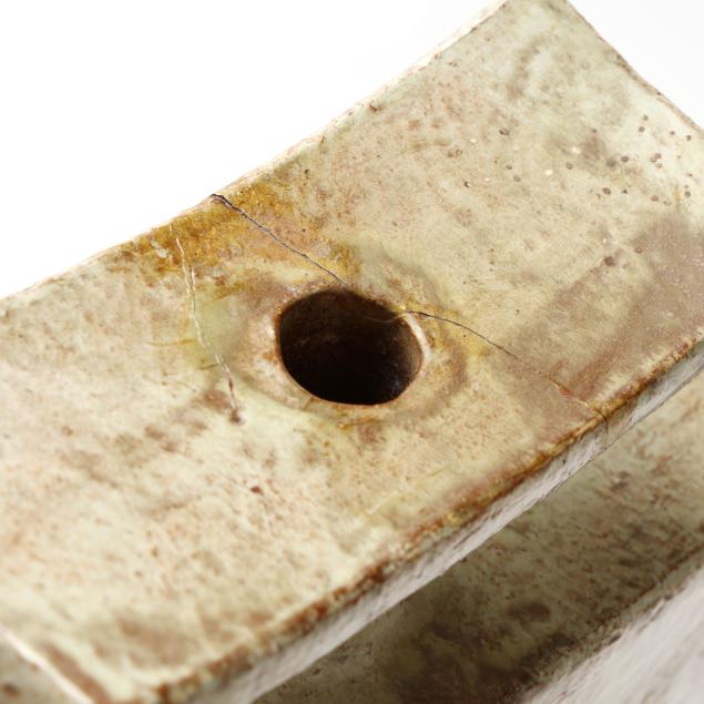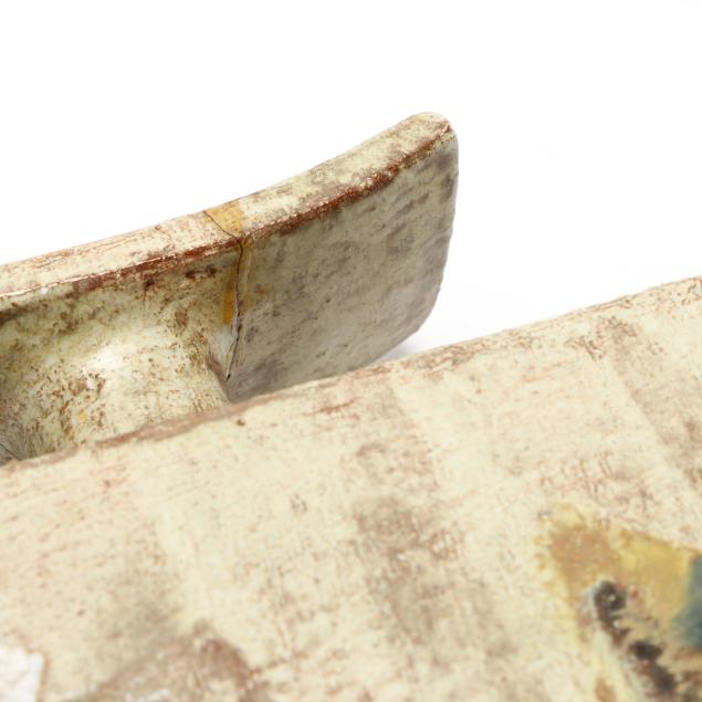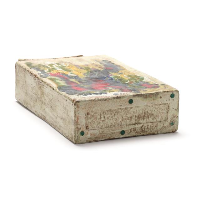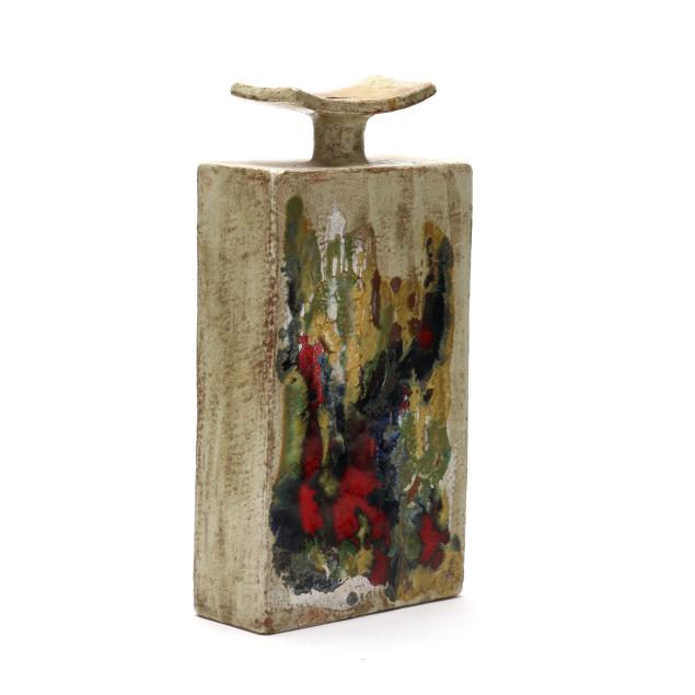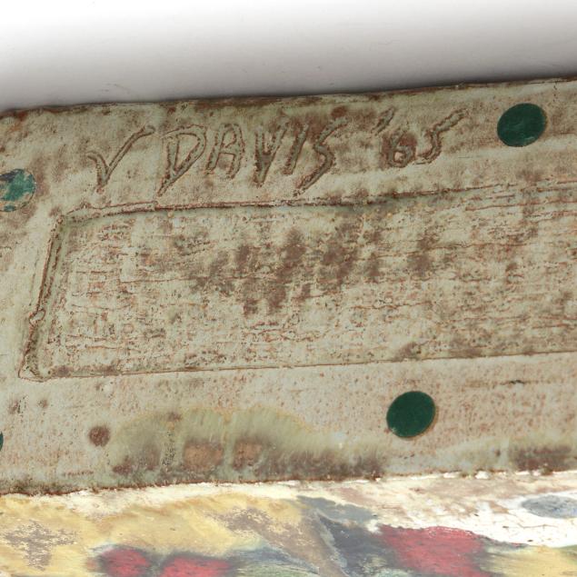 1965, earthenware rectangular shaped vessel with light green glaze to body and multicolor abstract glaze decoration to one side, inscribed "V. DAVIS '65" to underside.