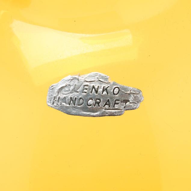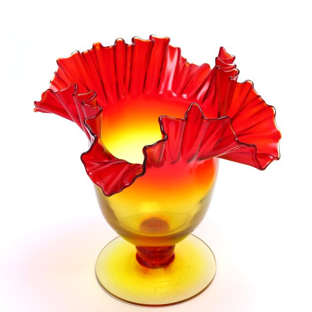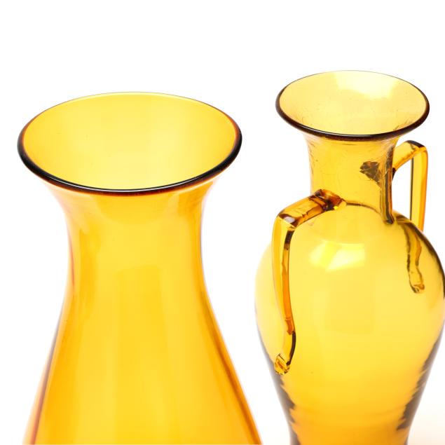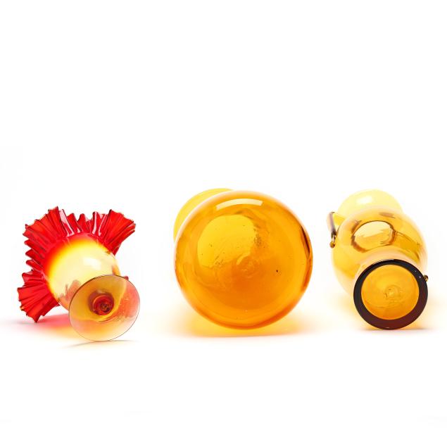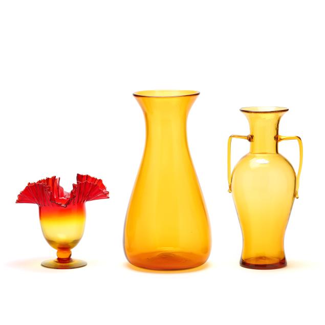 West Virginia, mid-20th century, including an amber colored baluster vase with double applied handles (14 in.); a wide teardrop shaped amber colored vase (16 in.); and an amberina footed vase with ruffled rim (8 in.), one with foil label.