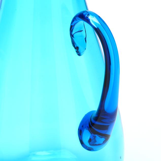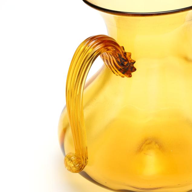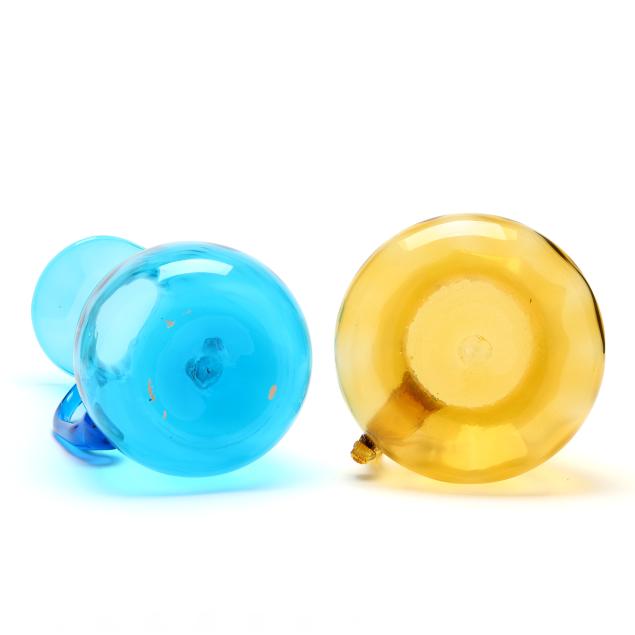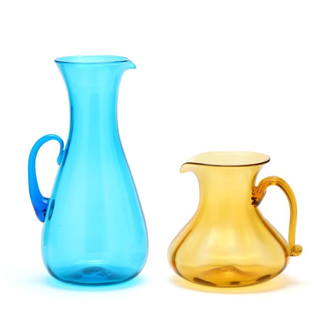 West Virginia, mid-20th century, including a large blue glass pitcher with applied handle (17.5 in.); and an amber colored pitcher with applied handle (9 in.), unmarked.