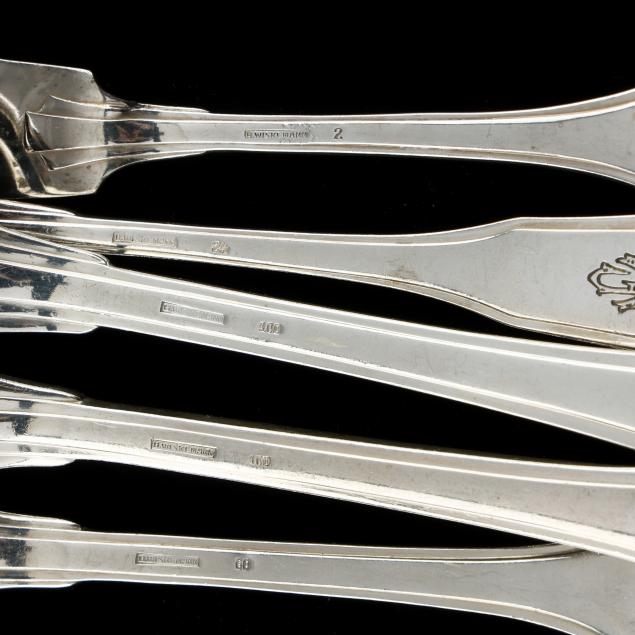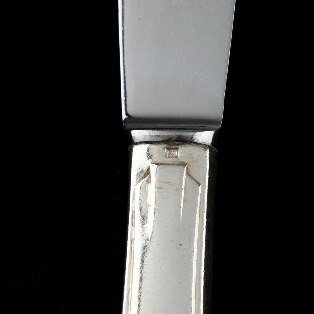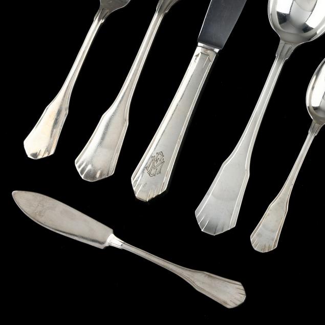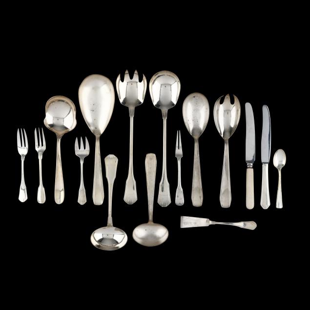 (109) pieces of the pattern to include (11) dinner knives (10 in.); (12) fruit knives (8 in.); (12) dinner forks (8 1/4 in.); (12) salad forks (6 1/2 in.); (12) fish knives; (12) tablespoons; (10) teaspoons; (11) fish forks; (12) fruit forks; a butter spreader; a cheese knife; a large salad serving set; and a gravy ladle; all with stylized period monograms to the verso handles. This lot also includes (24) pieces of assorted Belgian silver-plated flatware; and (10) Christofle silver-plated teaspoons; and (5) French wood handled knives; for a lot total of (148) pieces; presented in fitted flatware boxes.
