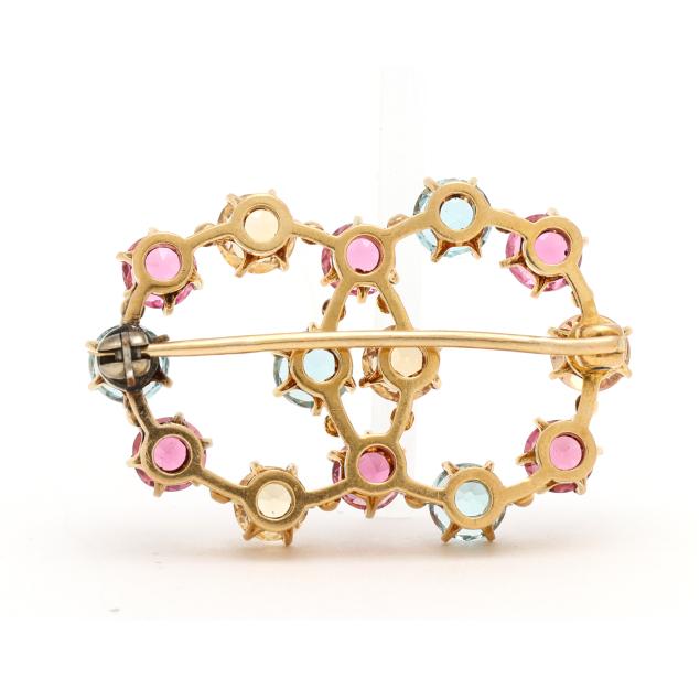 Set with alternating round cut blue, pink, and yellow topaz, completed with locking pin stem, XRF testing 18KT, pin and lock testing gold plated.
