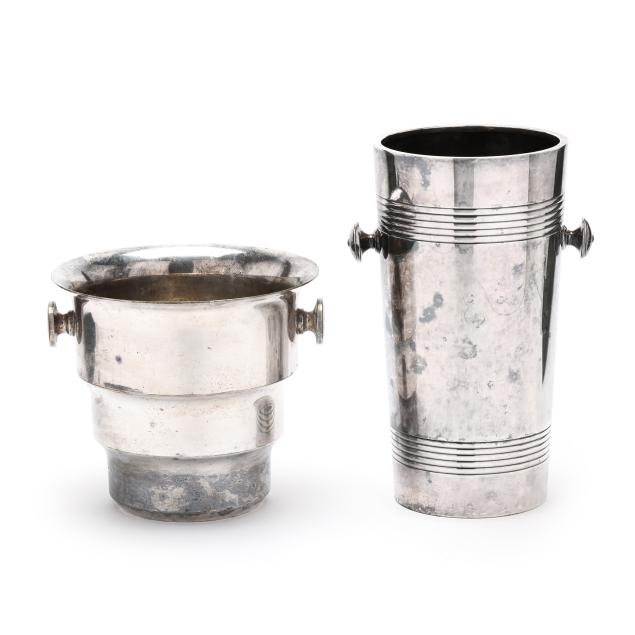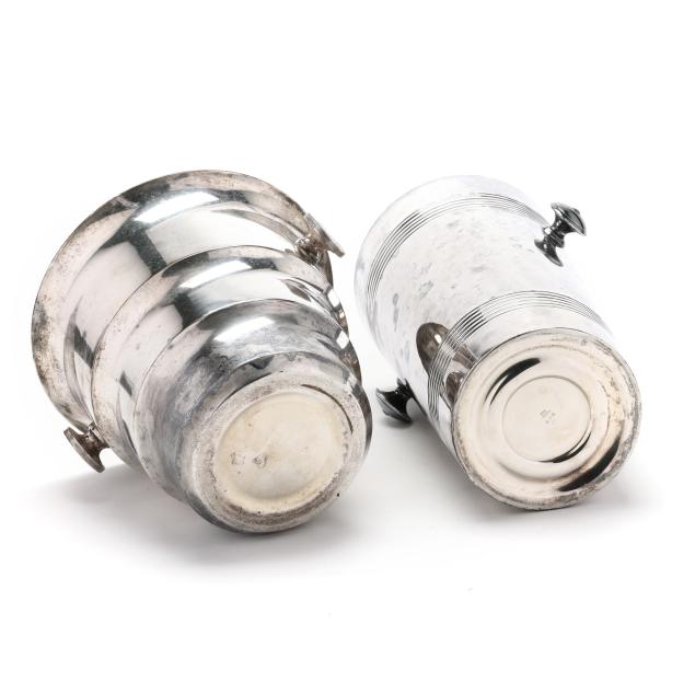 The larger by Christofle, narrow form with reeded decoration and double knob handles (11 1/8 x 5 3/4 in. dia.); the smaller, a tapered form with double knob handles, not marked (7 1/4 x 8 in. dia.); neither monogrammed.
