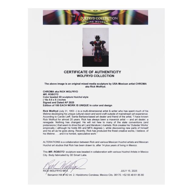 2025, artist proof from an edition of 100, ink signed, numbered AP and dated to the underside, Huichol style color beaded 3D sculpture, uniquely colored and designed in collaboration with various Huichol artists in Mexico city. Included with the Lot is a signed certificate of authenticity by the artist.