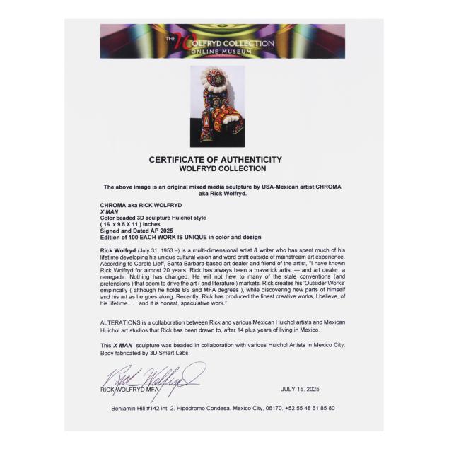 2025, artist proof from an edition of 100, ink signed, numbered AP and dated to the underside, Huichol style color beaded 3D sculpture, uniquely colored and designed in collaboration with various Huichol artists in Mexico city. Included with the Lot is a small ebonized plinth on which the sculpture rests and signed certificate of authenticity by the artist.