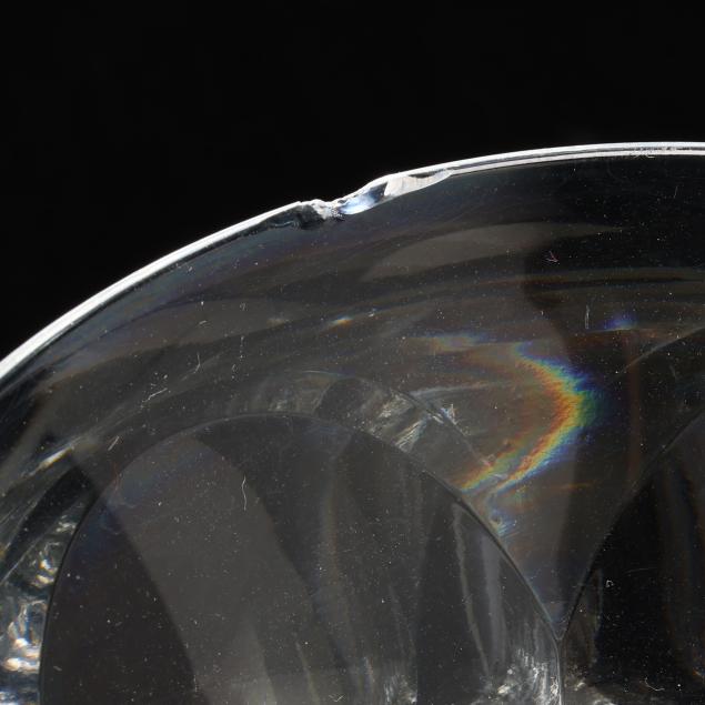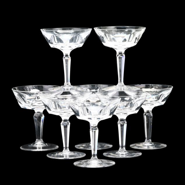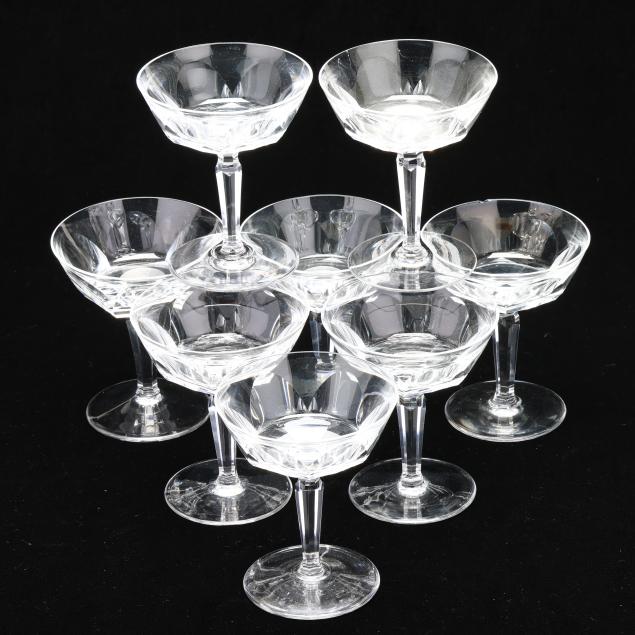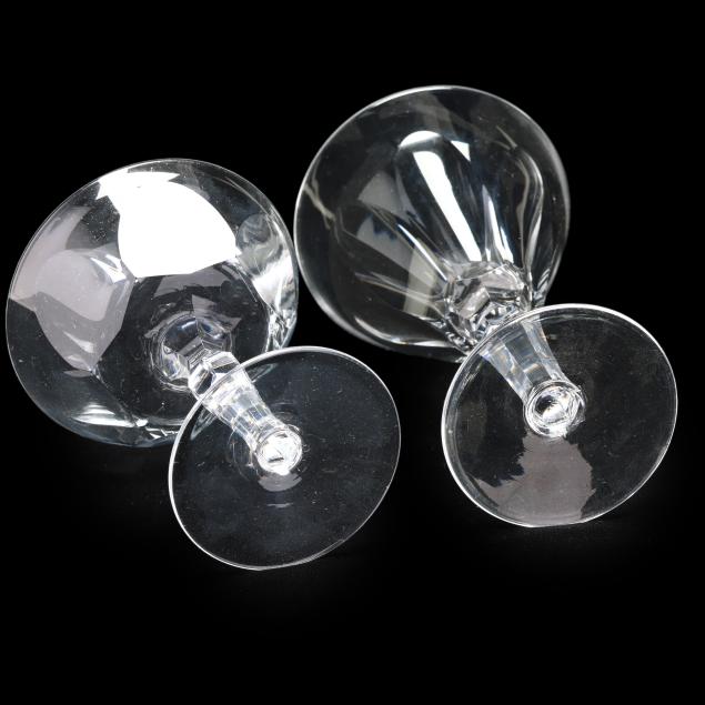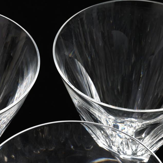 Smoothed fleabite to one water goblet rim; small crack in center of underside of one champagne glass, rim chip to another.