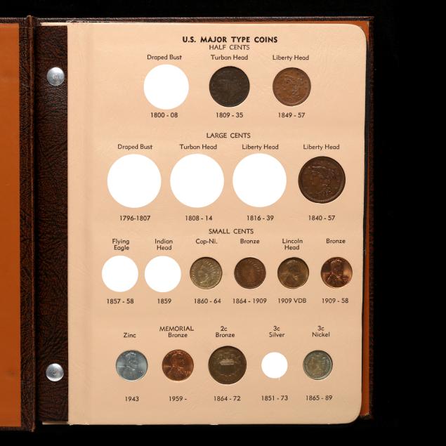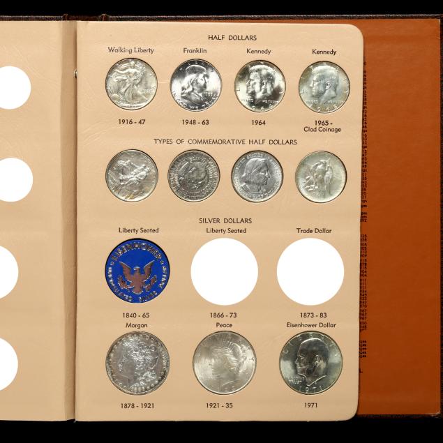 To include: Turban Head half cent, Braided Hair half cent, Braided Hair cent, Indian Head copper-nickel cent, Indian Head bronze cent, 1909 VDB, BU wheat cent, 1943 zinc/steel cent, 2-cent piece, 3-cent nickel, Liberty Seated half dime, Shield nickel with rays, Shield cent w/o rays, 1883 Liberty nickel No Cents, Liberty nickel with Cents, Buffalo nickel Type I, Buffalo nickel Type II, Jefferson nickel, Jefferson War nickel, Barber dime, Mercury dime, Roosevelt dimes, silver and clad, Liberty Seated quarter, Standing Liberty quarter, Silver and clad Washington quarters, Liberty Seated half dollar, Barber half dollar, Walking Liberty half dollar, Franklin half dollar, Kennedy half dollar in silver and clad, four commemorative coins celebrating Stone Mountain Georgia, Washington/Carver, Columbus and Texas; Morgan silver dollar, Peace silver dollar and Eisenhower dollar.