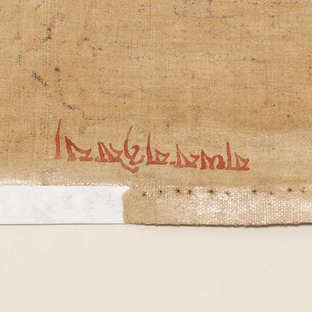 Late 18th or early 19th century, ground mineral pigments and gilt on fabric, with inscriptions in gold throughout, presented under glass with silk mat in gilt and green wood frame.