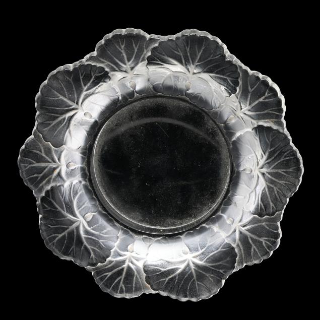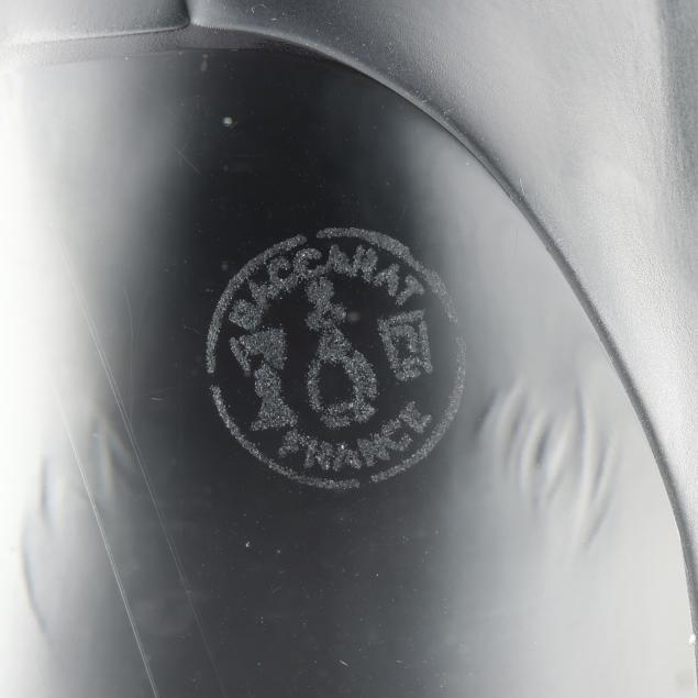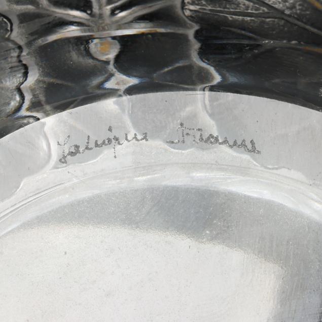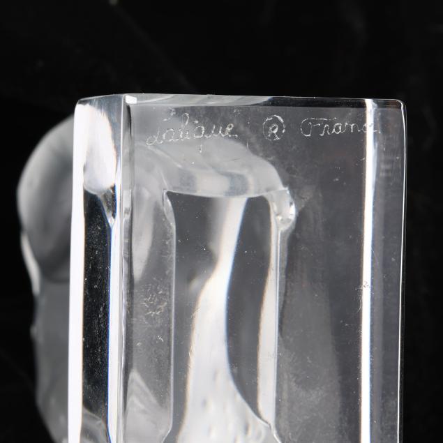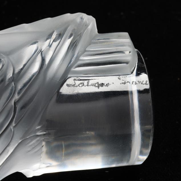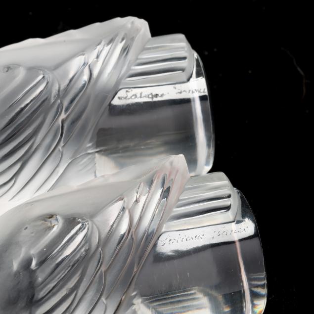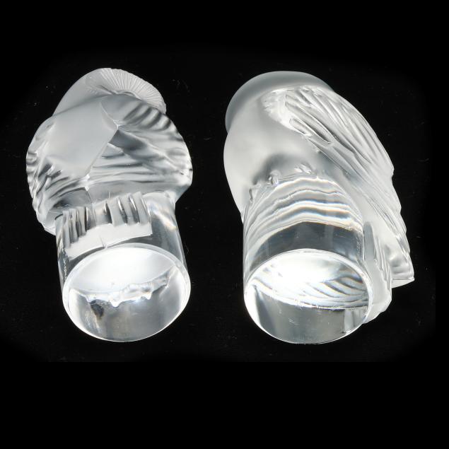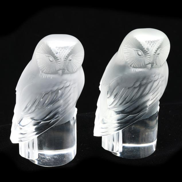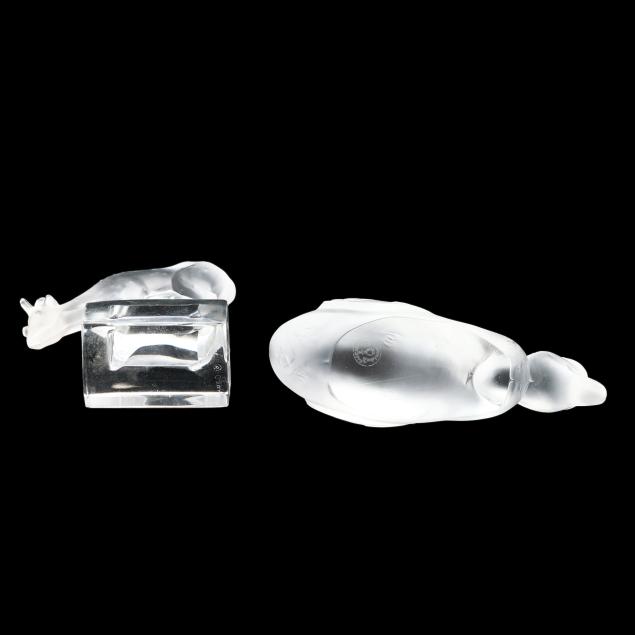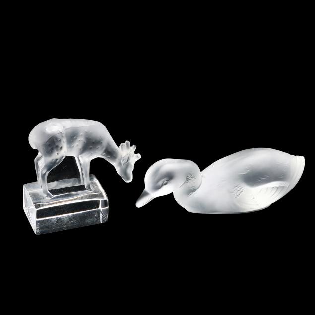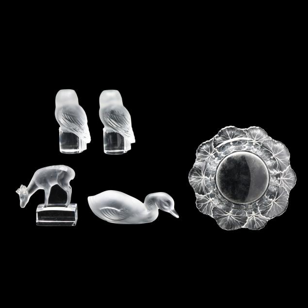 Honfleur deep saucer (5 3/4 in.); a Lalique deer paperweight (3 in.); a pair of Lalique owl paperweights (3 1/2 in.); and a Baccarat duck figurine (5 in. length), all marked.