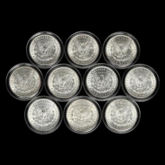 ten-10-mixed-date-bu-morgan-silver-dollars-in-capsules