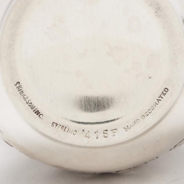 Pattern number 415F, featuring hand chased foliate motifs on a stippled ground, monogrammed.