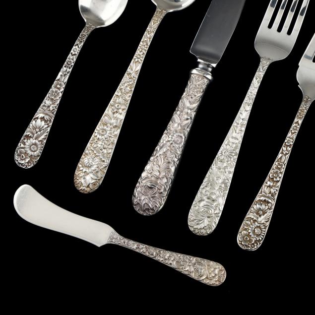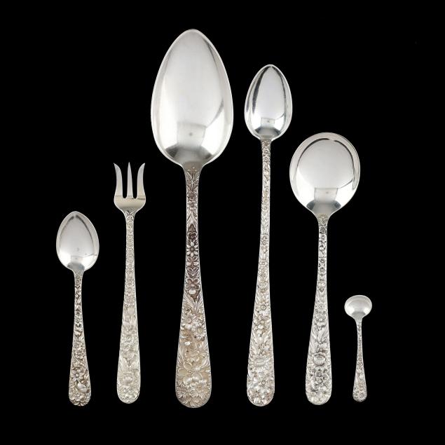 (106) pieces to include: (12) dinner knives (8 7/8 in.); (12) dinner forks (7 1/4 in.); (12) salad forks (6 1/4 in.); (12) teaspoons (5 7/8 in.); (6) oval bowl soup spoons; (6) round bowl soup spoons; (12) iced tea spoons; (12) butter spreaders; (6) seafood forks; (6) demitasse spoons; (4) salt spoons; and (6) tablespoons; most pieces without monograms; presented in a fitted flatware box.