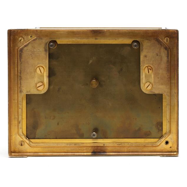 Slight bend to tip of minute hand; pendulum locked and not fully attached to movement, unable to test, surface wear and rubbing to gilt brass case; light wear to box exterior.