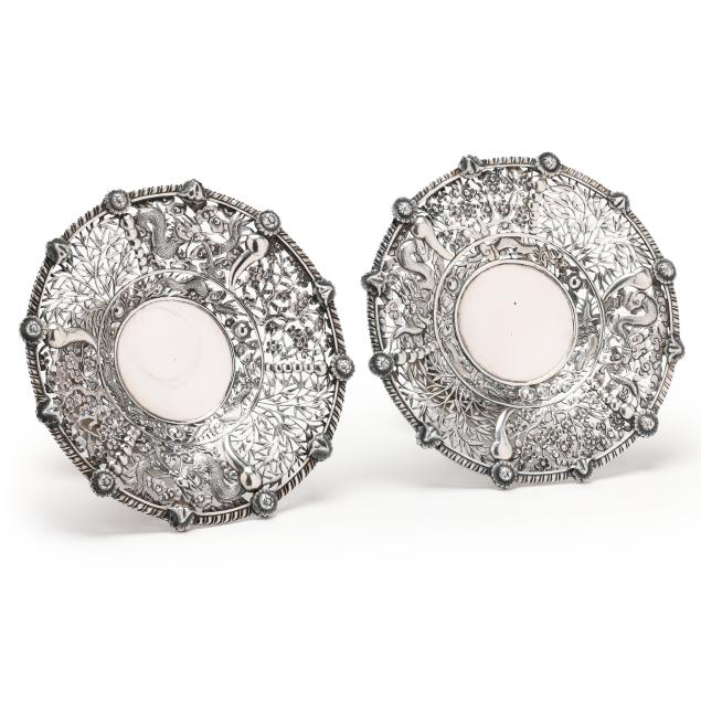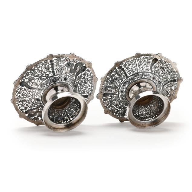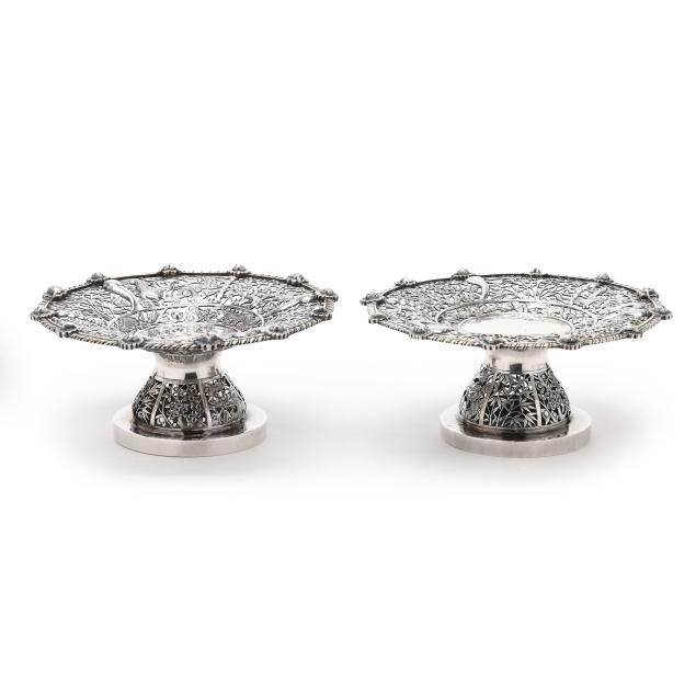 Each tazza featuring a wide spreading rim with delicate pierced work panels of bamboo, prunus blossom and dragon motifs, the gadrooned edge with applied blossoms, raised on a conforming foot and a slightly rounded and pierced stem continuing the motifs on the rim.