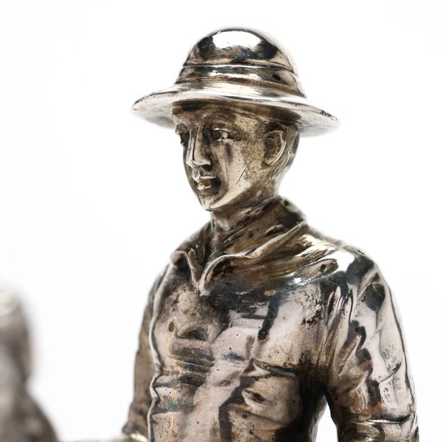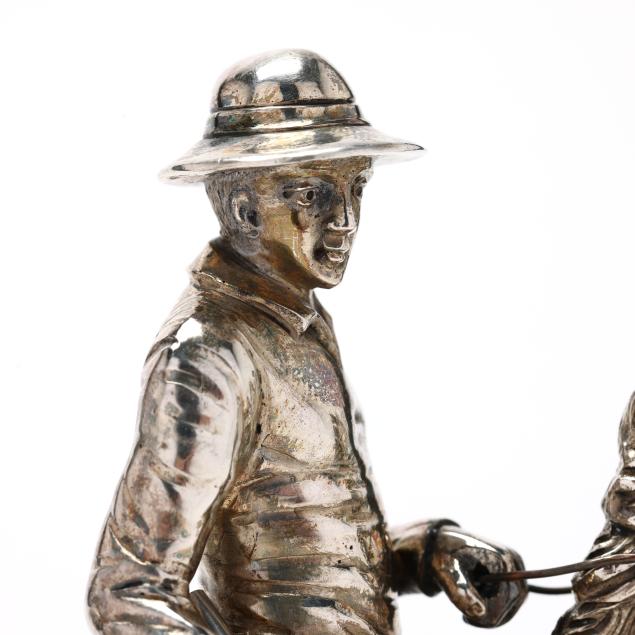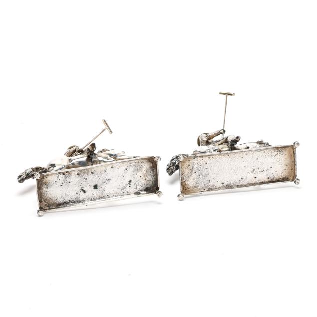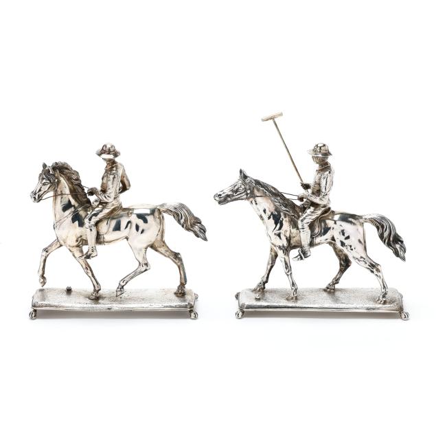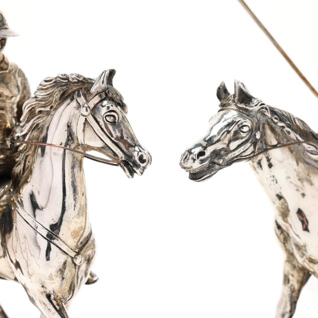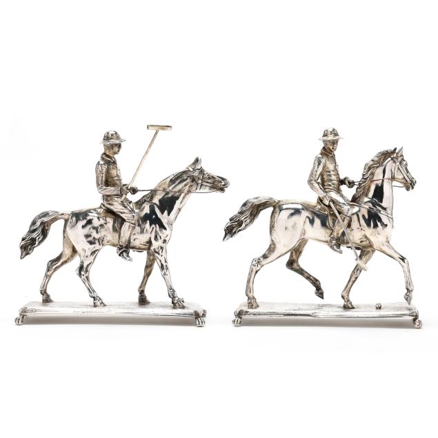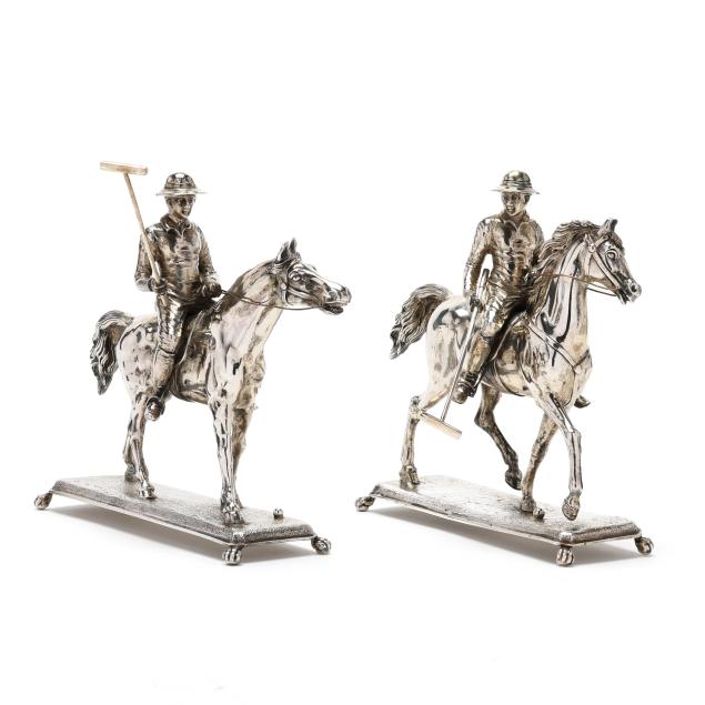 Circa 1900, .800 silver, mark of B. Neresheimer & Söhne to each textured plinth, each modeled in the form of a polo player with his mallet astride a horse, XRF tested.