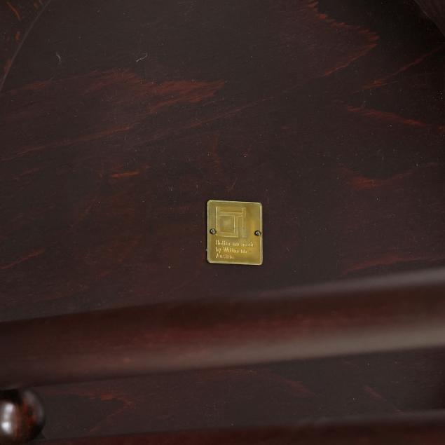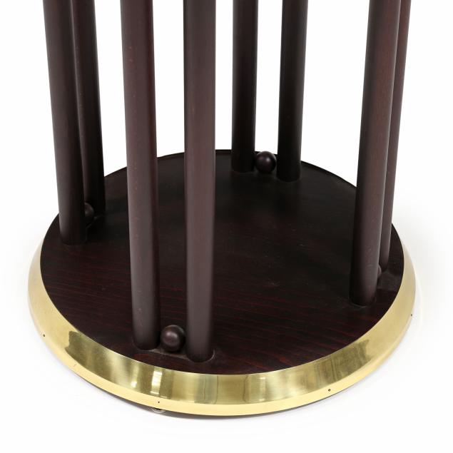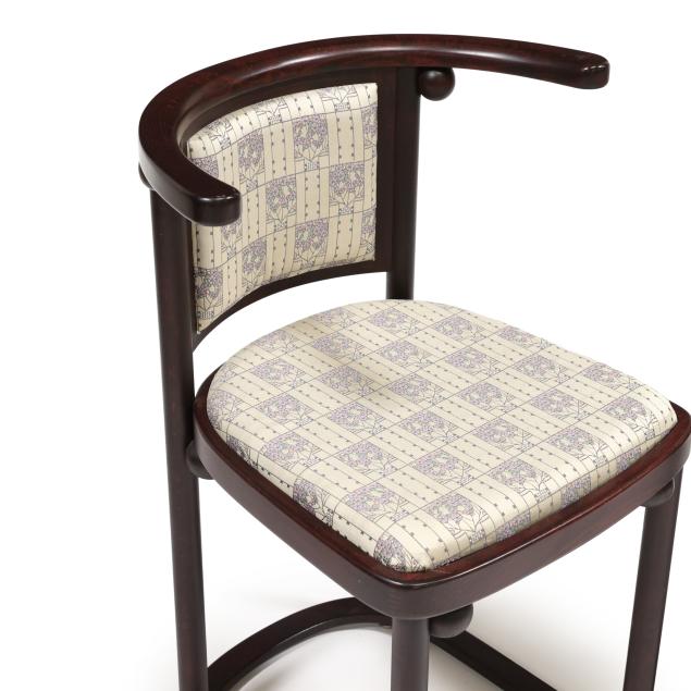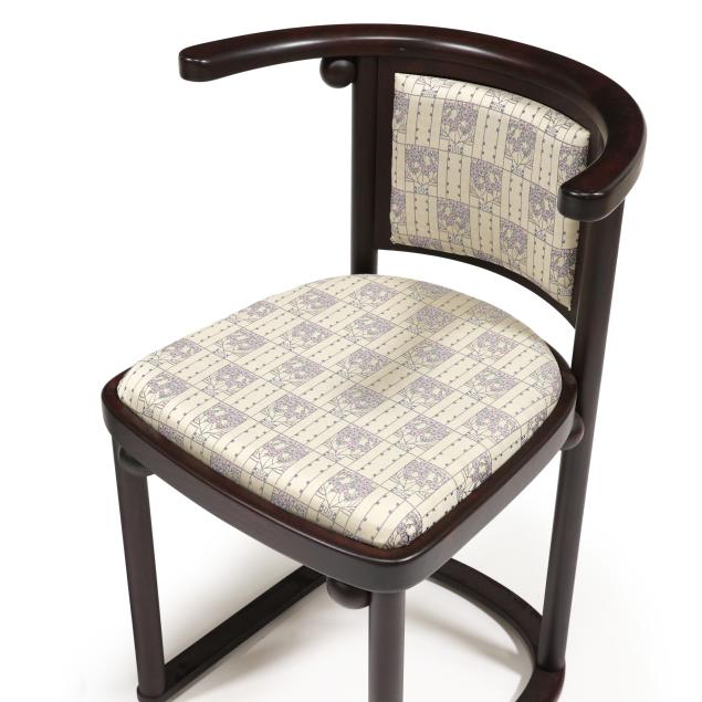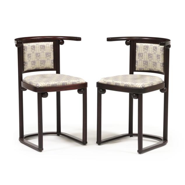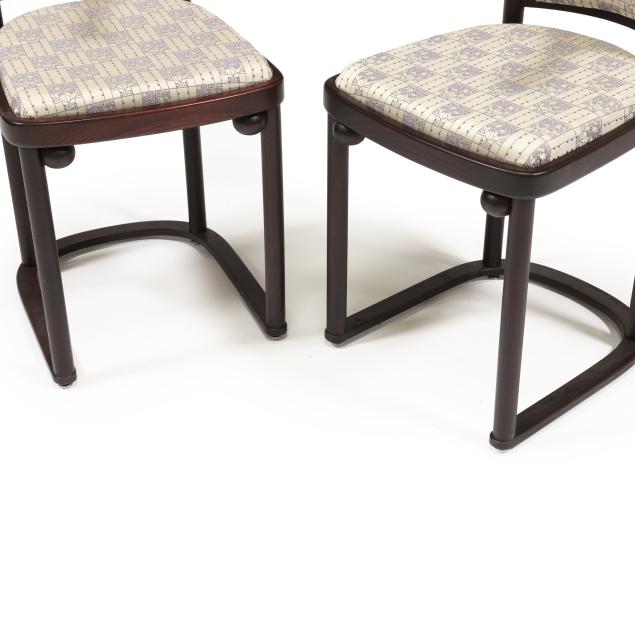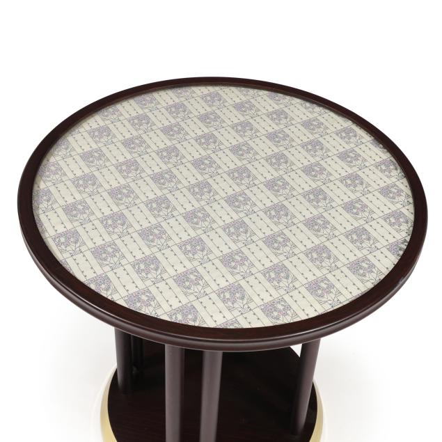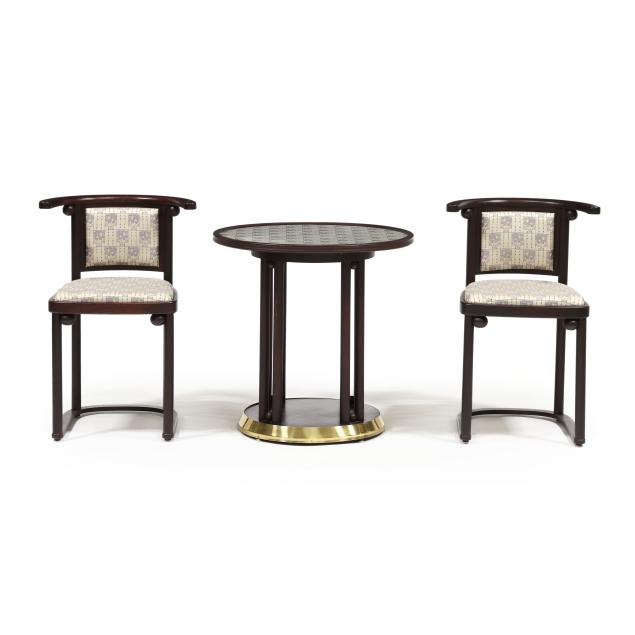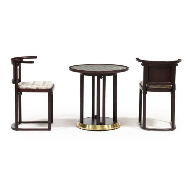 Late-20th-century production by Wittmann, beech frames with secessionist style upholstery, circular top table with inset glass and brass covered base edge (26 x 25.75 in. diameter); and a pair of curved chairs (29.75 x 20 x 21 in.), labeled.