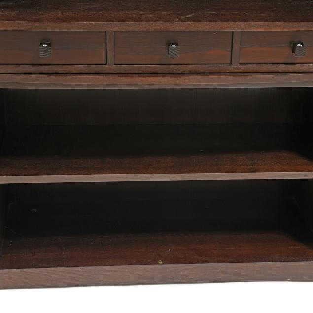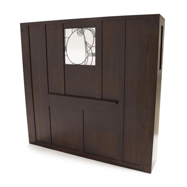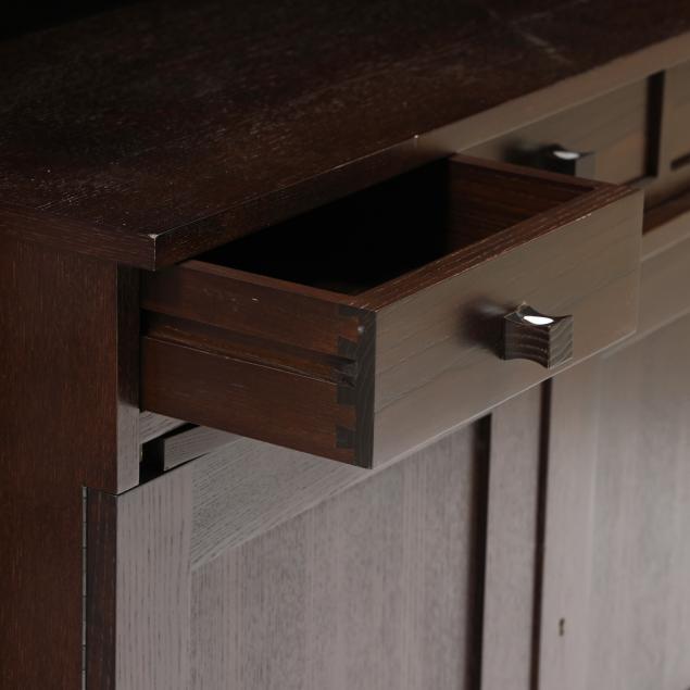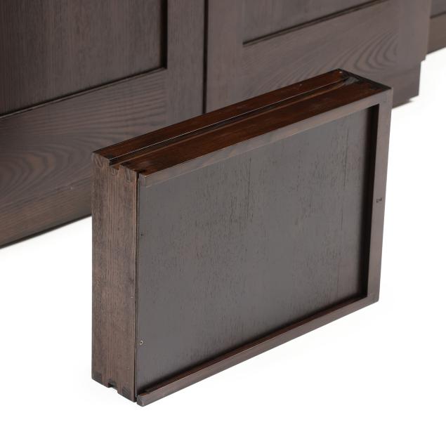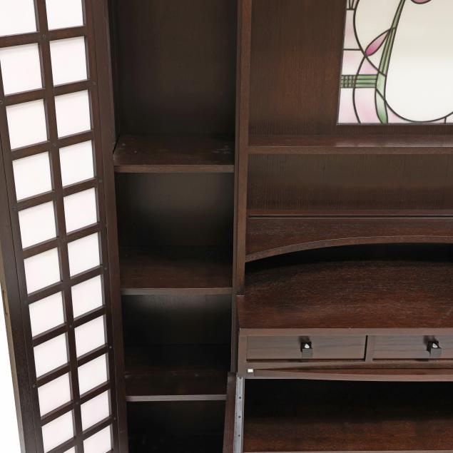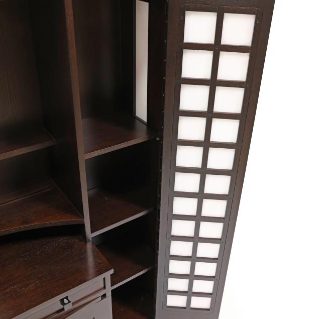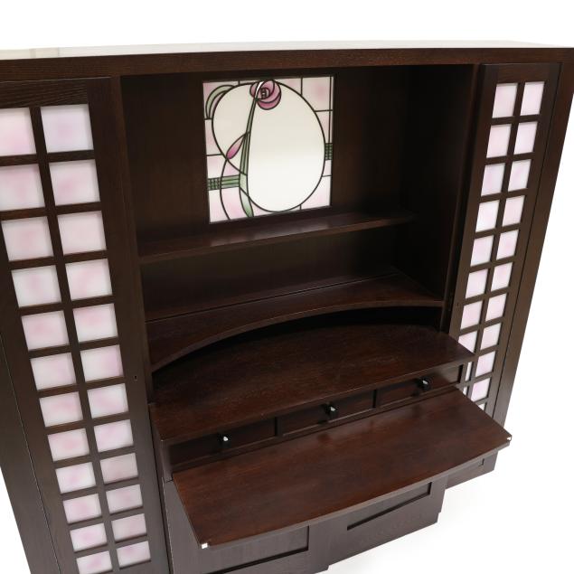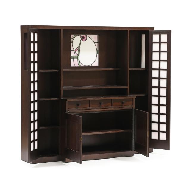 Late-20th-century production by Cassina, ebonized oak and veneer, one part form, central open cabinet with two shelves and rear stained glass panel, over three small drawers, over a pull out serving slide over two hinged cabinet doors with shelved interior, flanked by two hinged tall stained glass panel doors with shelved interior, stained glass sides panels, finished rear with exposed stained glass window, labeled.