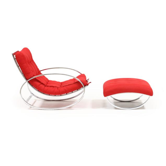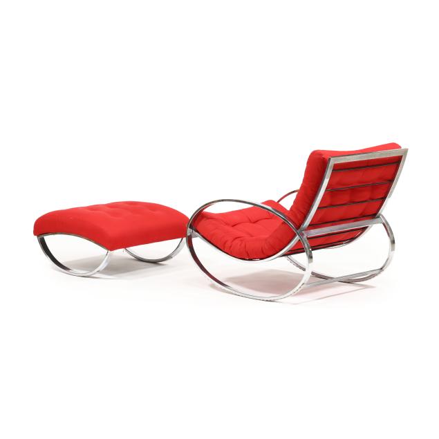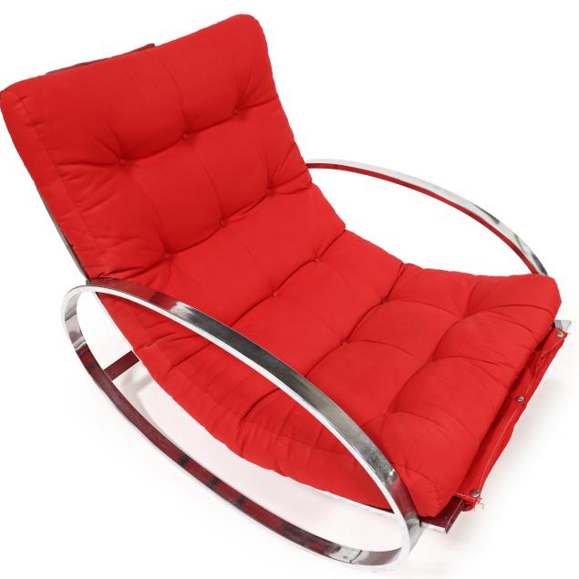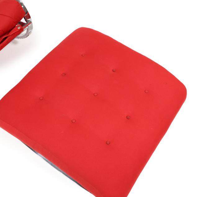 1970s, for Selig, tubular chrome frame with vintage red upholstery, cord supports, unmarked.