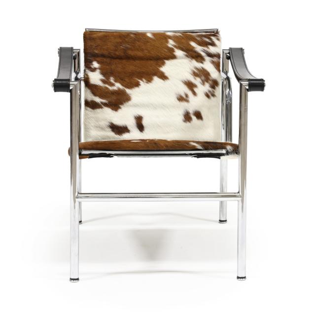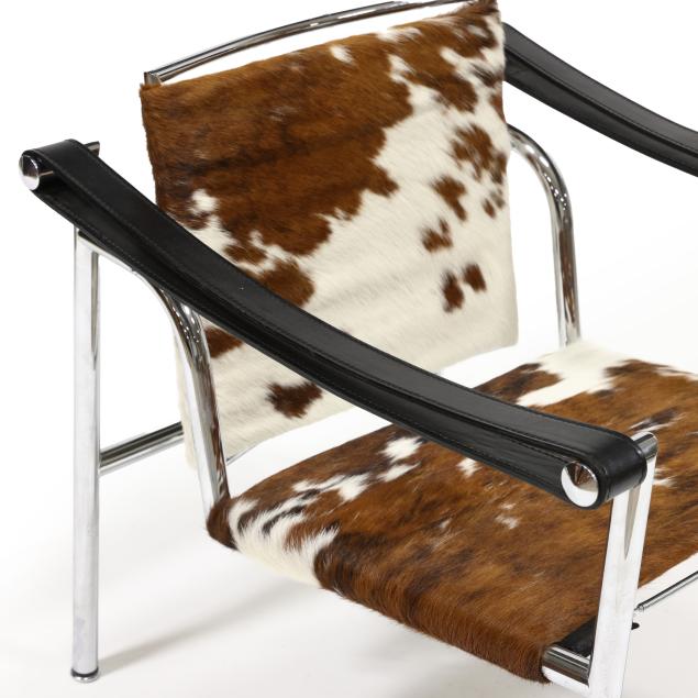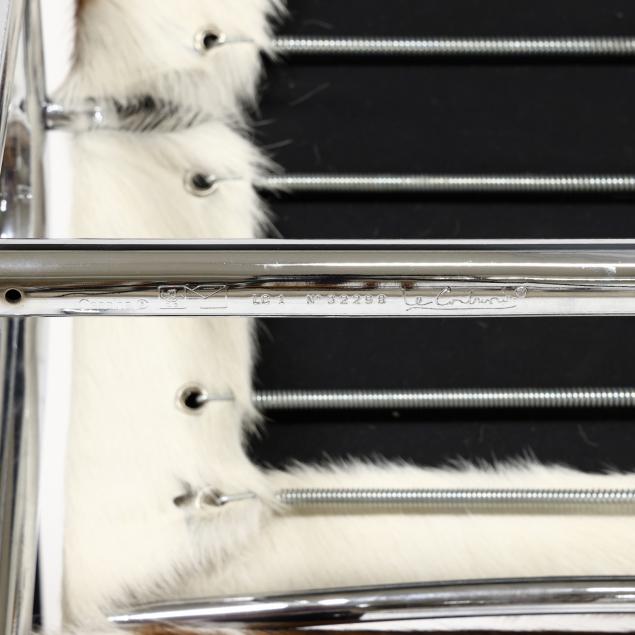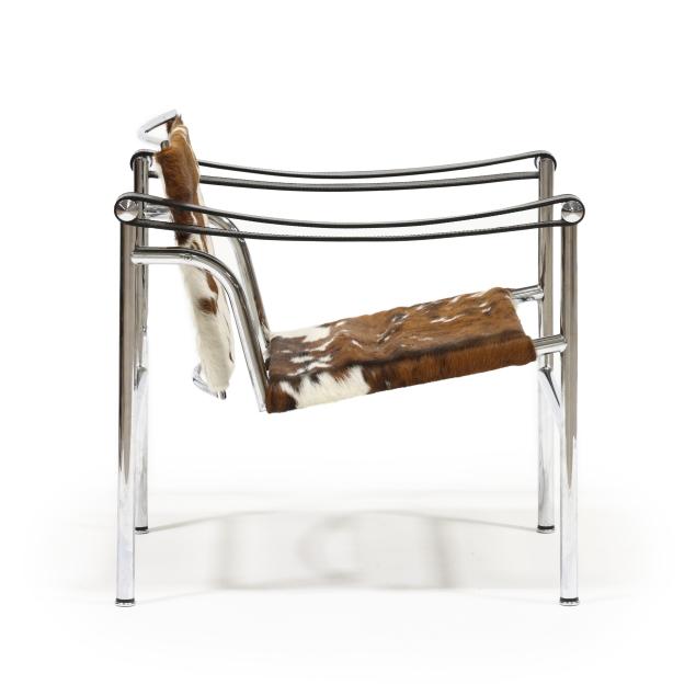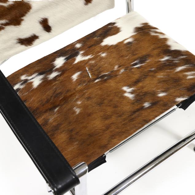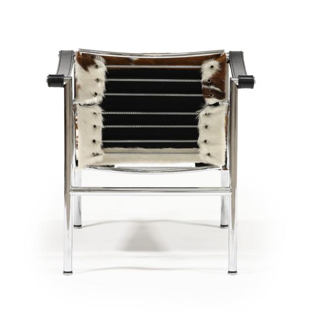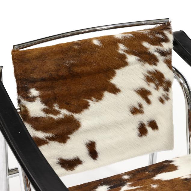 Late-20th-century production by Cassina, polished steel frame with pony hide and black leather strap arms, hinged back, stamped to underside of rear seat rail.