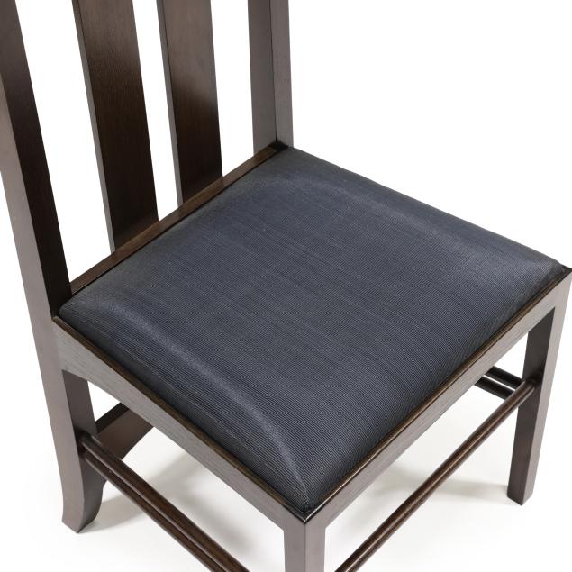 Late-20th-century production by Cassina, oak, pierced crest rail, tall two splat back with pierced squares, navy slip seat, straight legs with rounded stretcher base, marked.