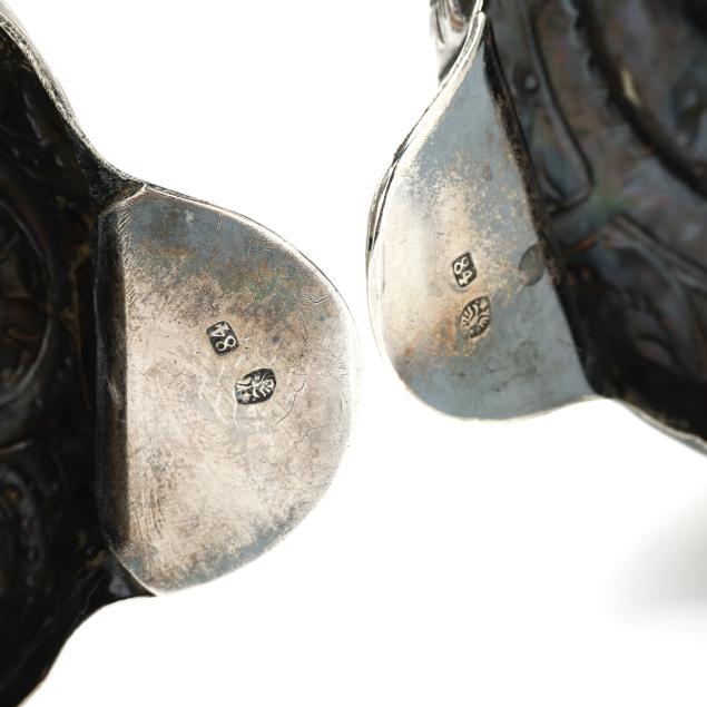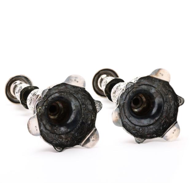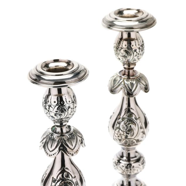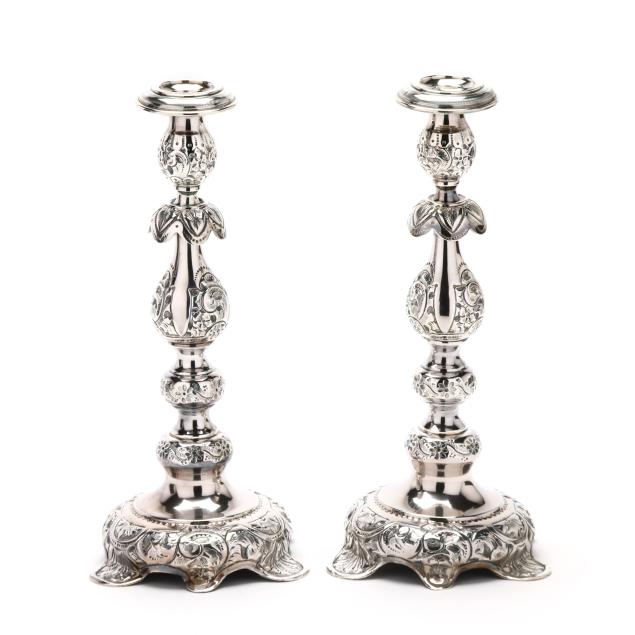 Late 19th century, 84 zolotniki, stamped with doubled headed eagle, each a repousse form with hand chased decoration to the foot and balusters, topped with separate bobeches, not monogrammed.