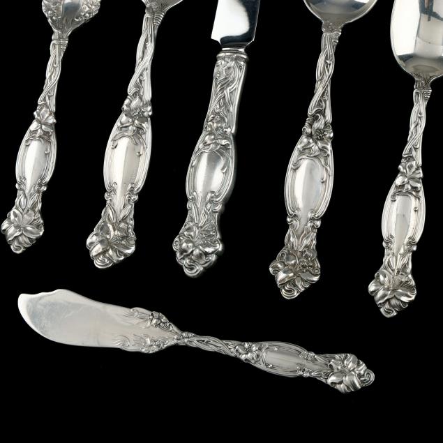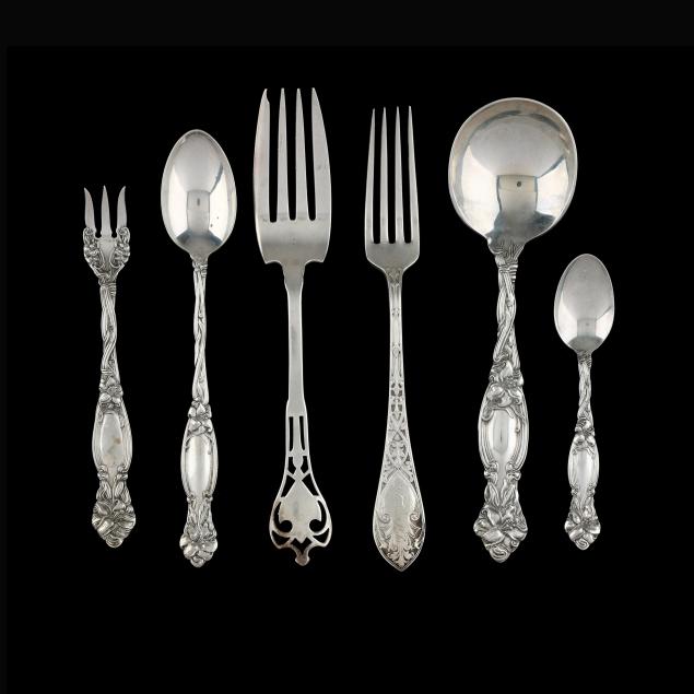(120) pieces, service for twelve, including: (12) knives (9 1/4 in.); (12) forks (7 1/2 in.); (12) salad forks; (12) teaspoons; (12) dessert / oval soup spoons; (12) gumbo spoons; (12) parfait spoons (6 5/8 in.); (12) oyster forks; (12) butter spreaders; and (12) demitasse spoons. No monograms.