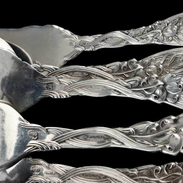Patented in 1903, the Frontenac pattern was created by designer John T. Clulee and quickly became one of the most celebrated American silver flatware patterns in the Art Nouveau style. Distinguished by its sinuous floral motifs and graceful detailing, it remains highly sought-after among collectors. The present service is especially desirable for its remarkable completeness and for the absence of monograms or any evidence of monogram removal.