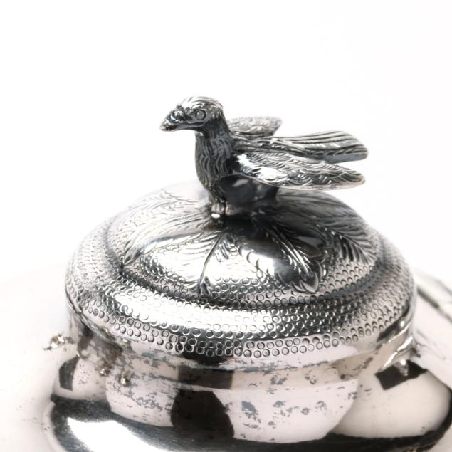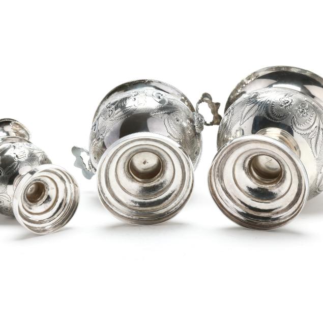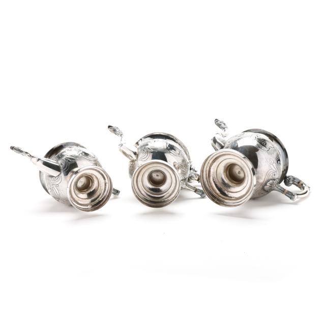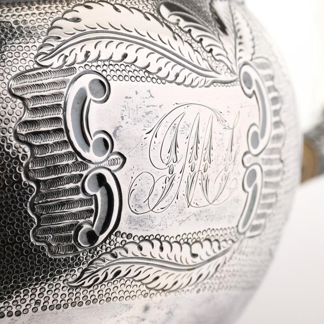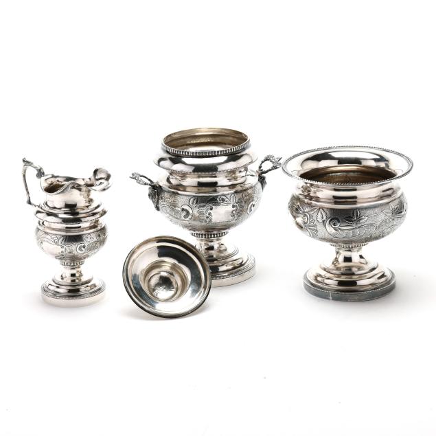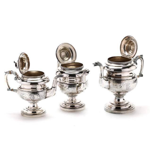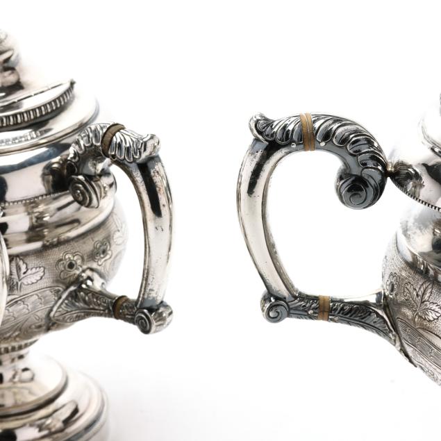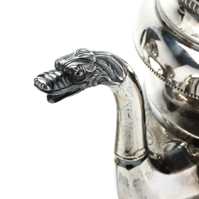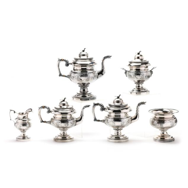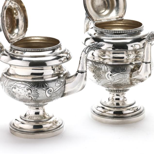 Including four pieces with mark of Samuel Williamson, circa 1820s - (2) teapots (10 1/4 in. and 11 1/2 in.), a sugar bowl with cover, and a cream jug. Each with period script monogram "JMG," and featuring finials modeled as birds with spread wings, each with chased and punchwork designs, each with open cartouche opposite monogramed cartouche, the sugar bowl featuring cast handles in the form of floral cornucopias and supported by a female mask below.