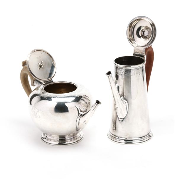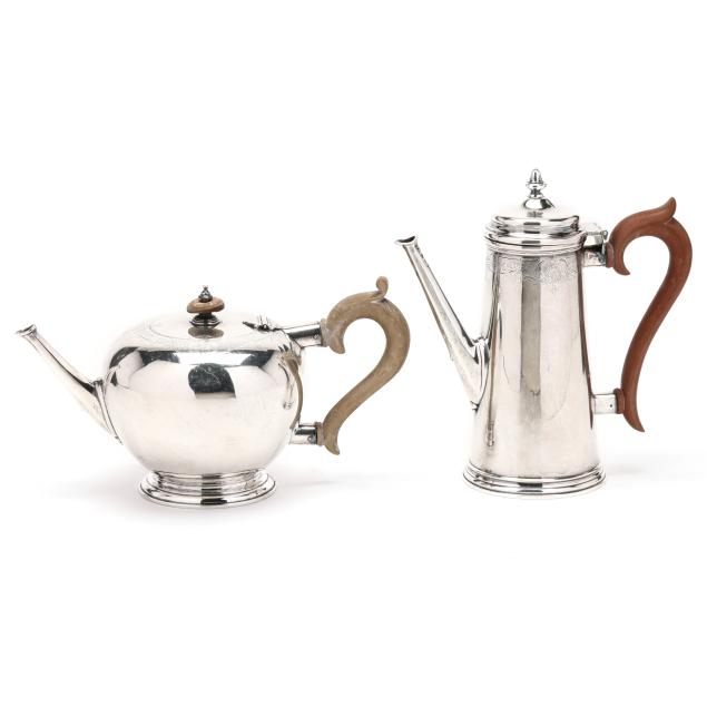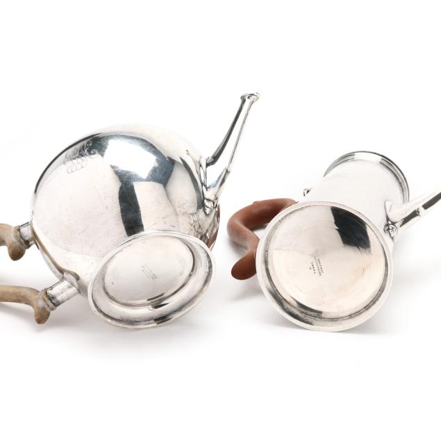 Good estate condition, the teapot handle has been gued; the wooden handles and finial with varied stains and some age cracking.