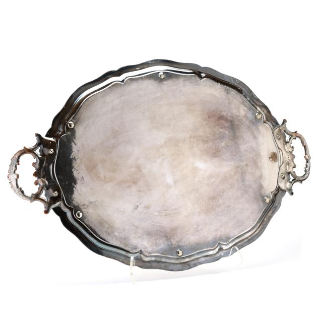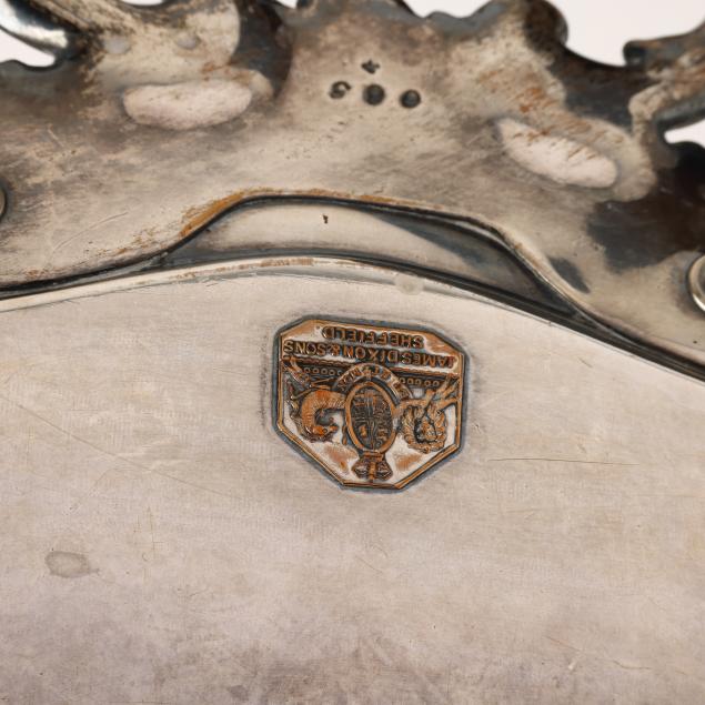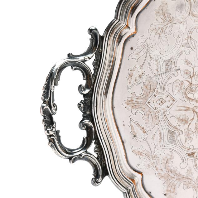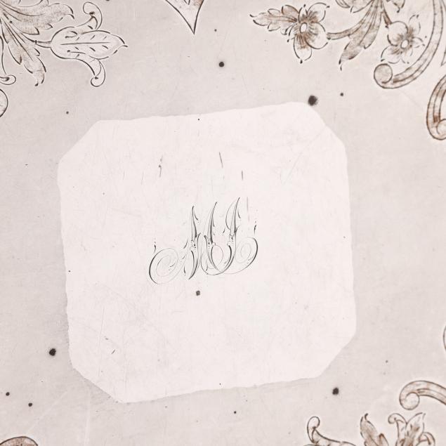 Circa 1835, silver over copper, with applied shield mark to underside, model number 665, with inset silver plaque with period engraved monogram "MJ," the well with hand-engraved floral and foliate scrollwork and strapwork.