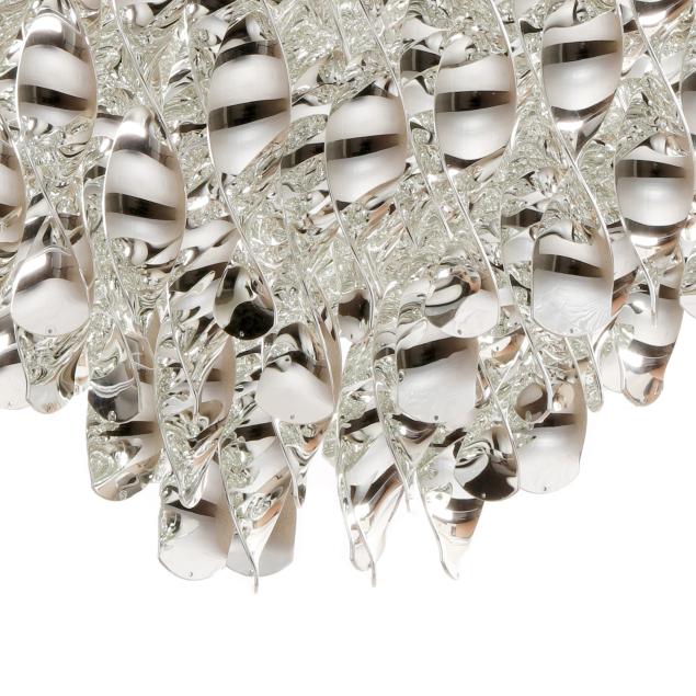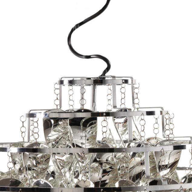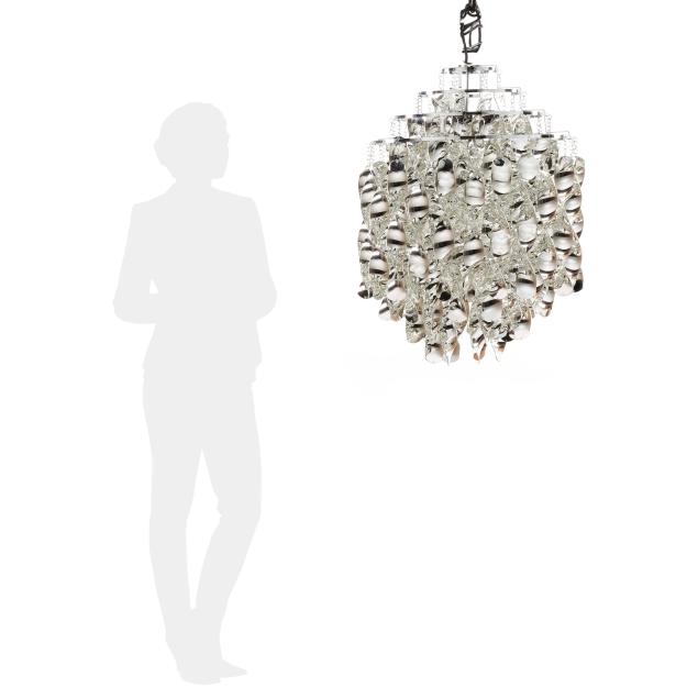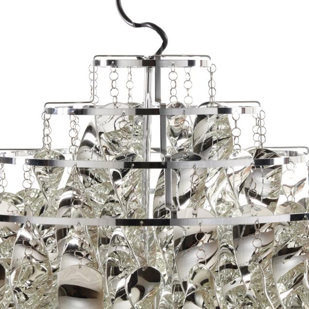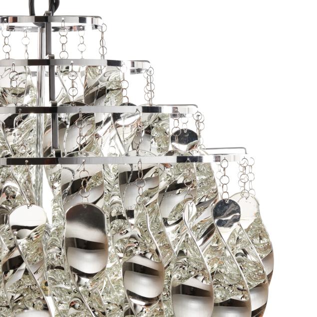 Originally designed 1969, three-tier one light form pendant with cast ABS plastic spirals, stainless steel rings, and chrome plated metal canopy, includes assembly instructions and ceiling mount.