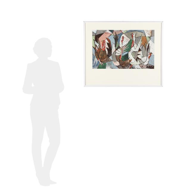 Gouache and mixed media on paper, signed at lower right, retaining gallery label, matted and framed below Plexiglass.