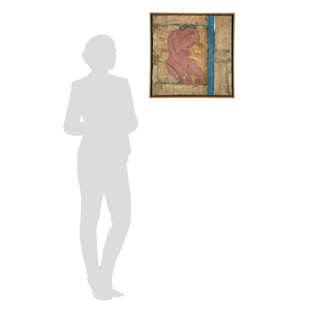 Oil and mixed media on canvas collage, circa 1960, retaining artist label to verso, framed.