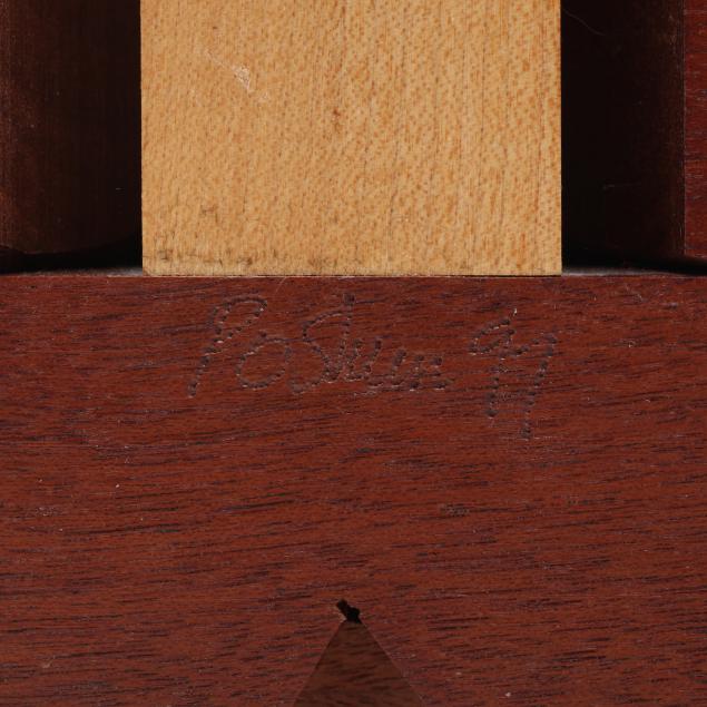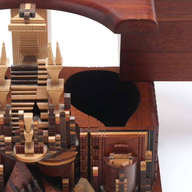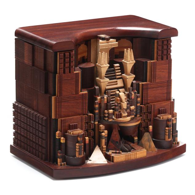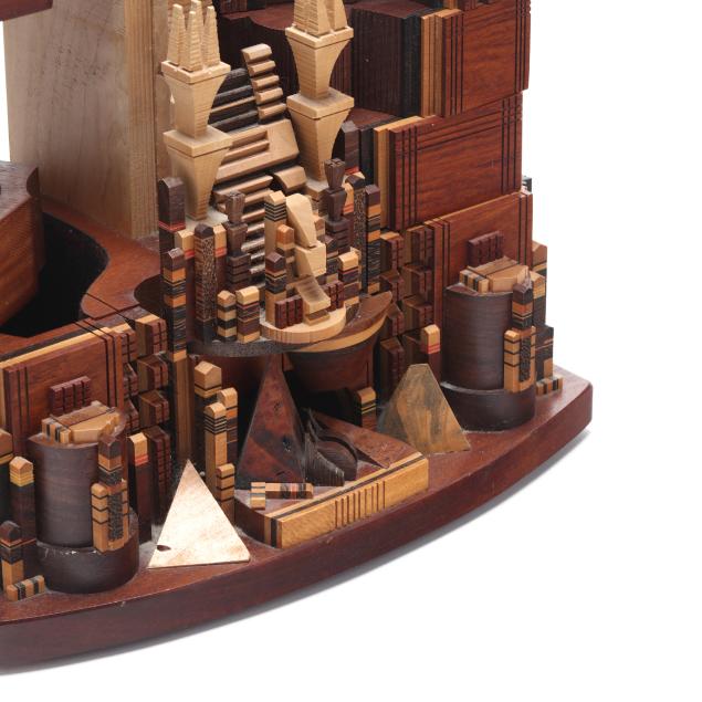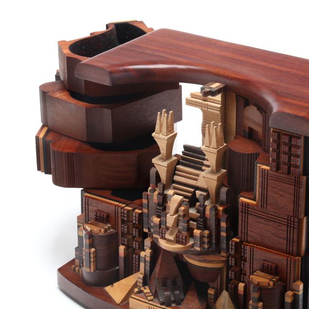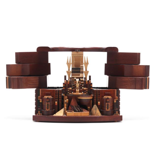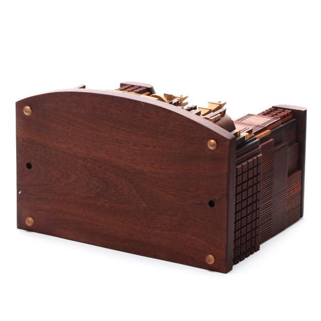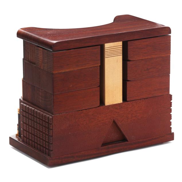 California, 1997, crafted of narra, mahogany, wenge, maple, koa, cherry, and pernambuco woods, featuring (8) felt-lined tiered compartments that swing outward from central geometric towers, signed and dated "Po Shun 97" to posterior, includes label with list of materials and care instructions.