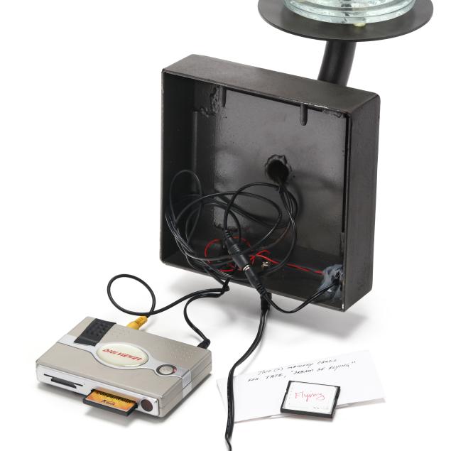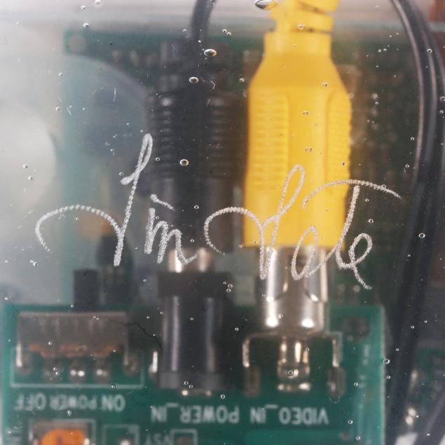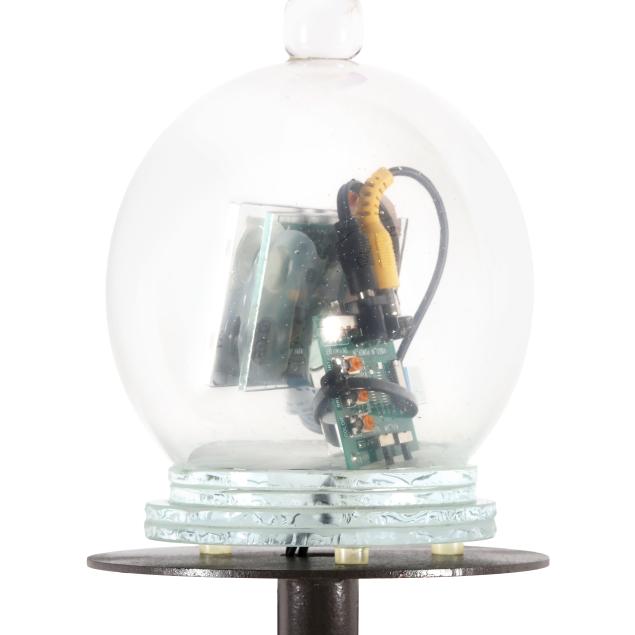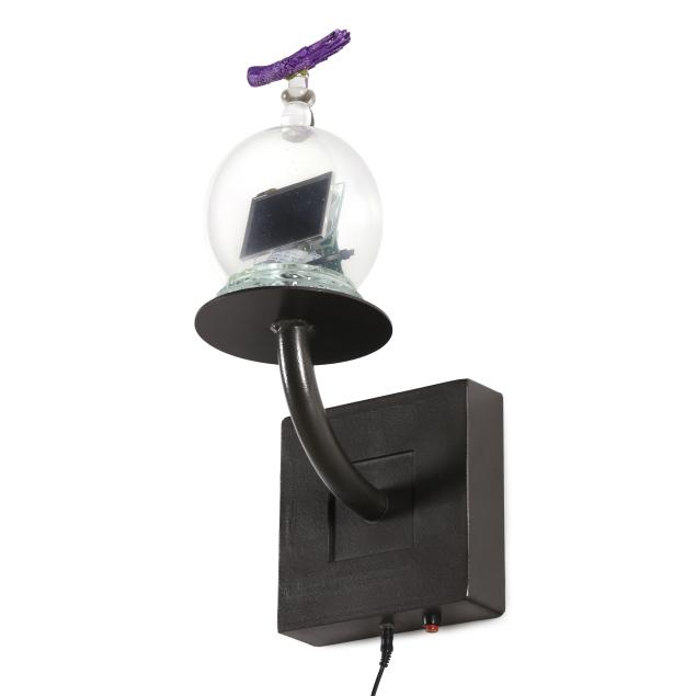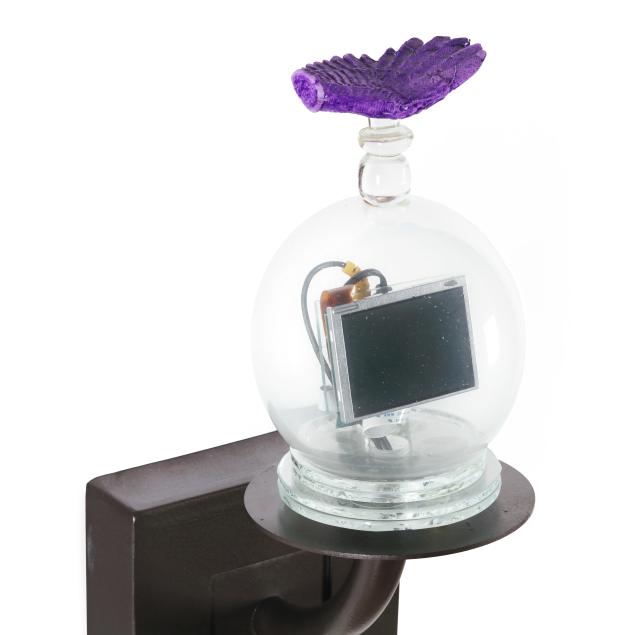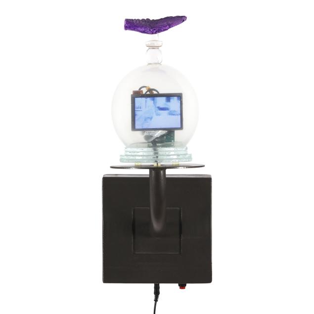 circa 2008, blown and cast glass, electronic components, original looped video, signed to the underside, displayed on a painted steel wall bracket.