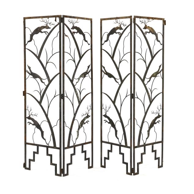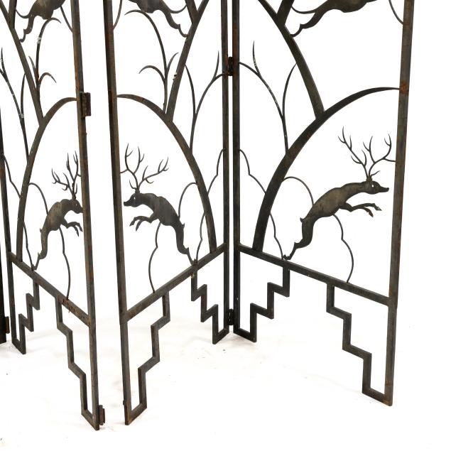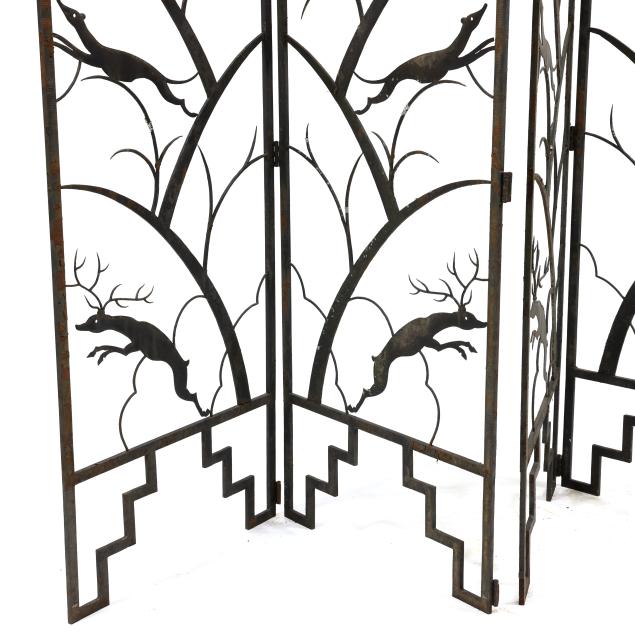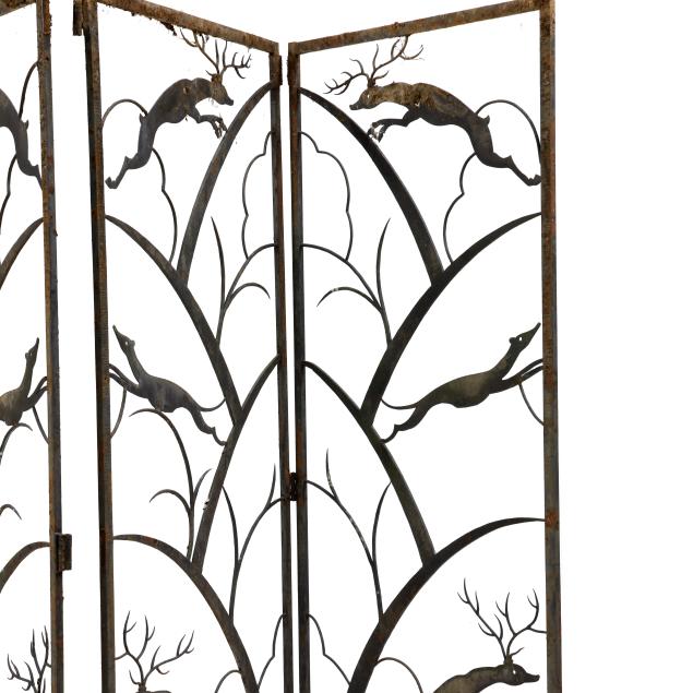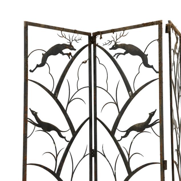 Circa 1930, black painted iron, four wrought iron panels with stag and hunting hound motifs, chiseled surface highlights and borders, stepped feet, unmarked.