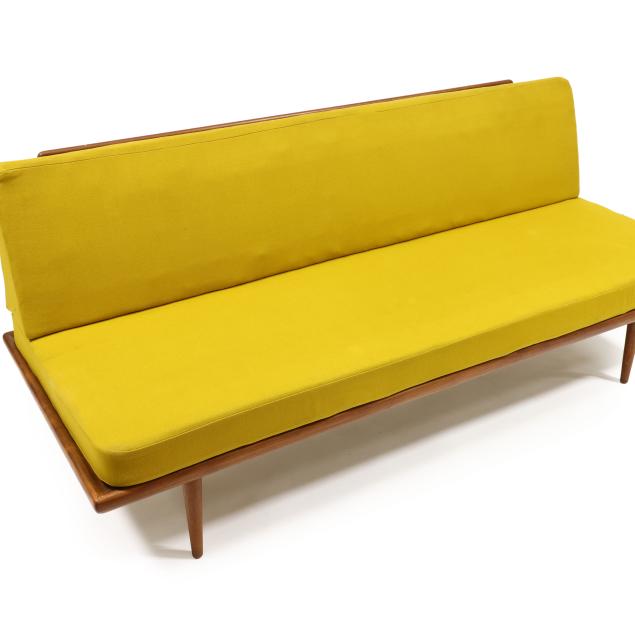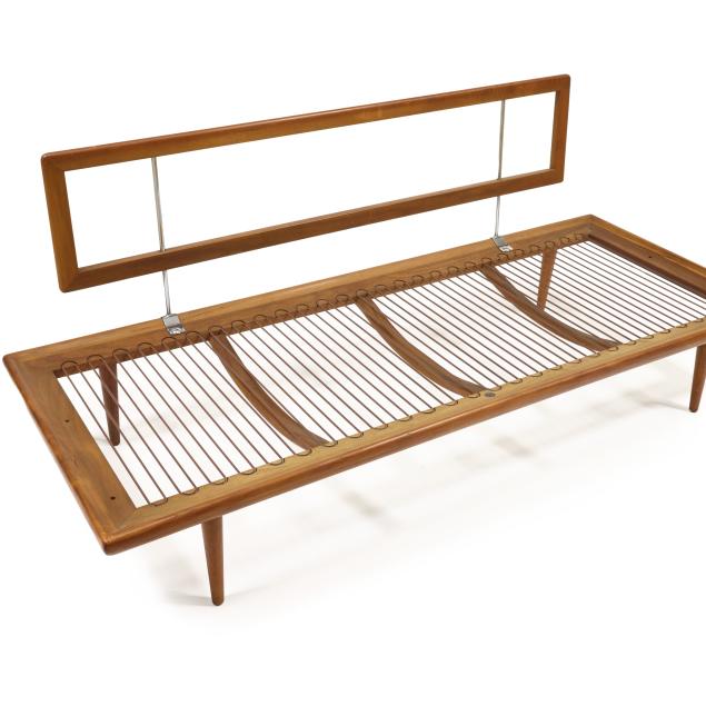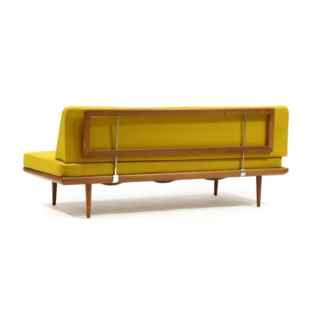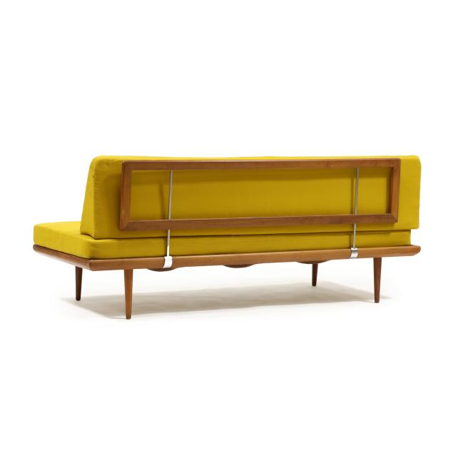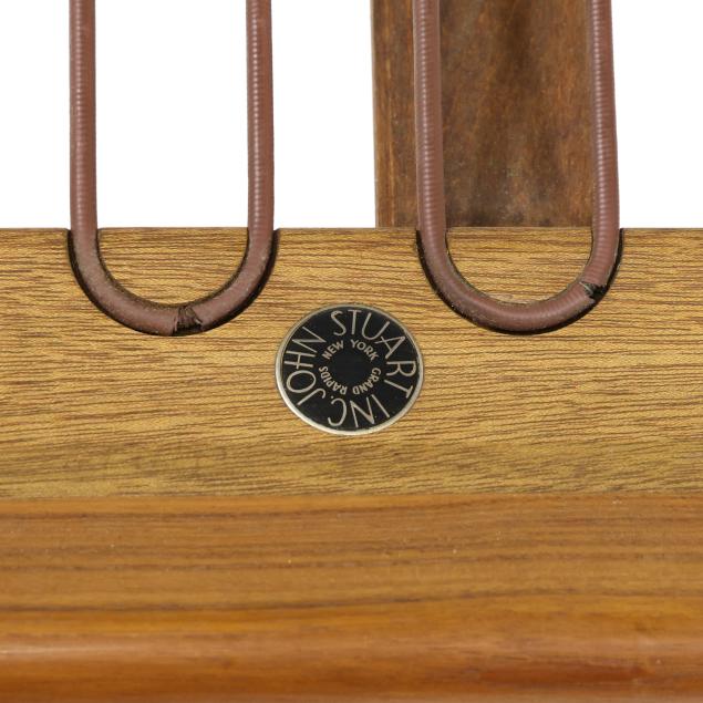 Circa 1960, for John Stuart, New York, two yellow spring cushions, teak frame with coil supports and chrome armatures, rounded tapered legs, labeled.