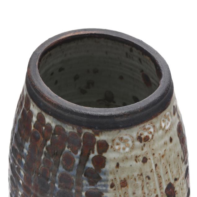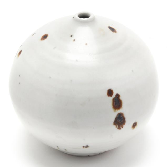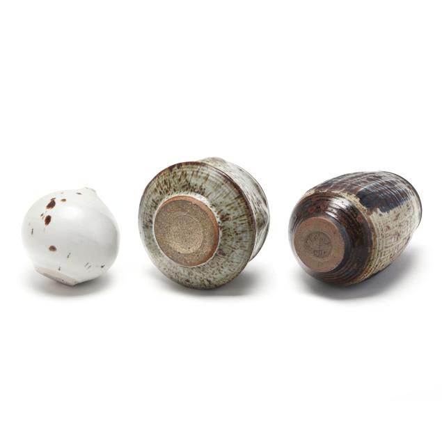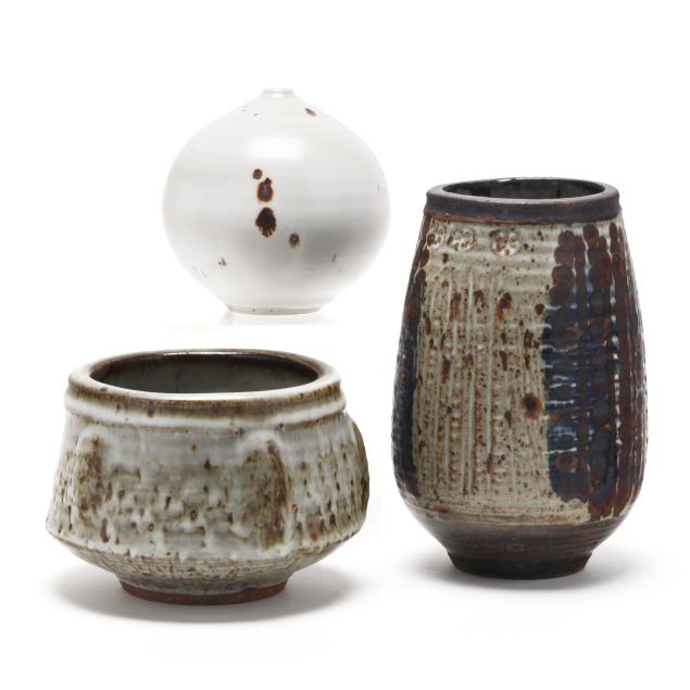 Ojai, California, circa 1970-1995, (3) vessels, the first, a footed stoneware vase with mottled white and cobalt ground, decorated with copper glaze streaks and dots as well as sgraffito linework to body, each side with three starbursts stamped underneath rim (7 1/8 x 5 in.); the second, a squat stoneware vase with white mottled glaze and press molded decoration to body (4 x 5 1/2 in.); and a white glazed porcelain weed pot with speckled copper glaze decoration (4 3/4 x 4 3/4 in.), all inscribed "Vivian + Otto" to underside.