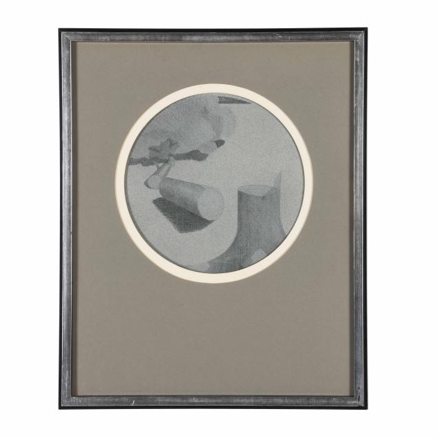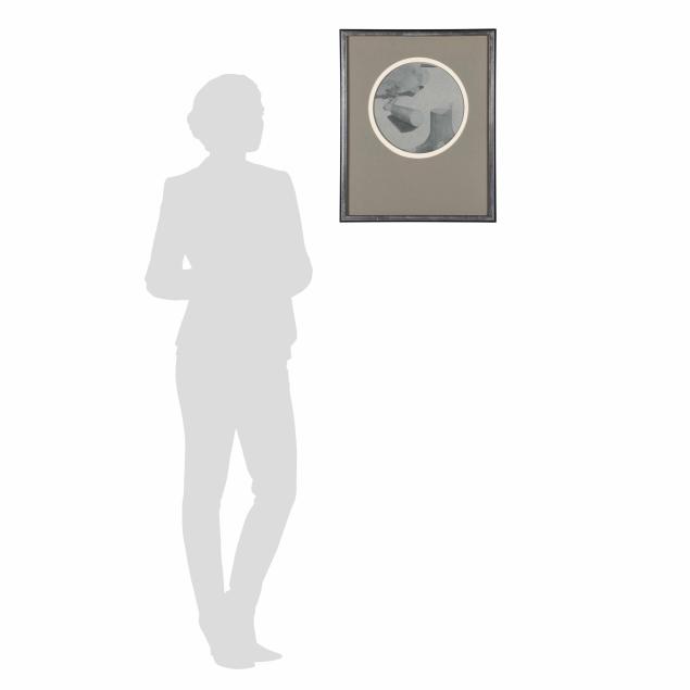 Pencil and polymer on paper, appears unsigned, retaining unidentified exhibition label to verso, matted and framed below glass.