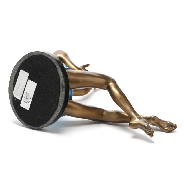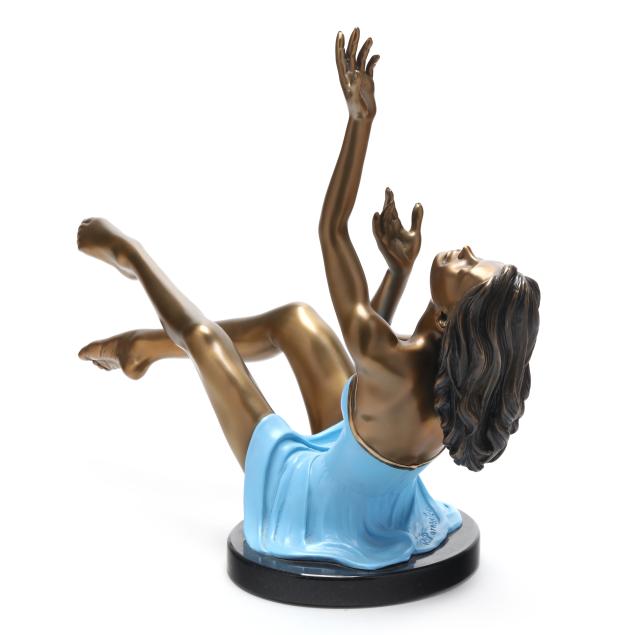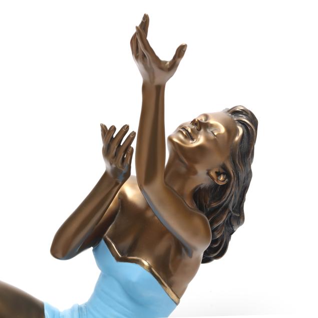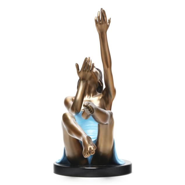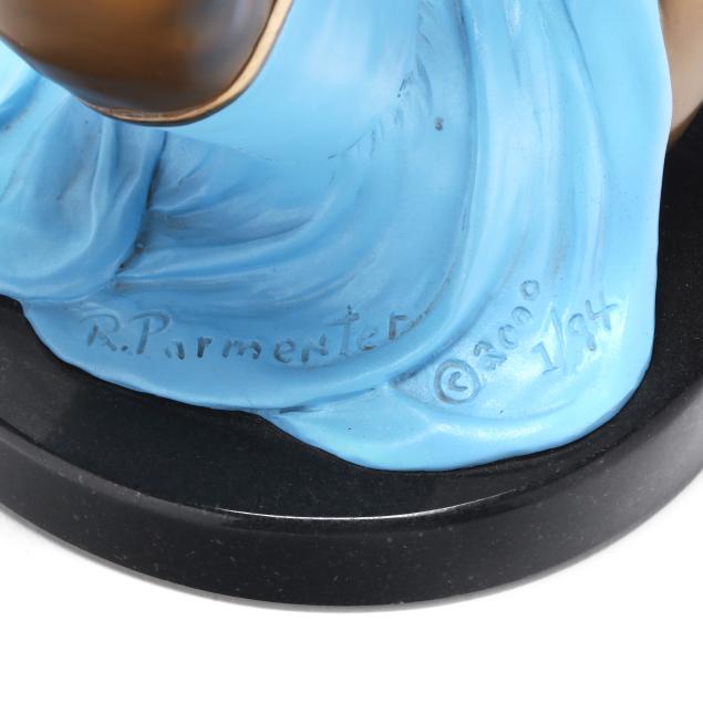 Patinated and cold-painted bronze, edition number 1/94, signed and dated "R. Parmenter / © 2000," mounted on an oval polished stone base.
