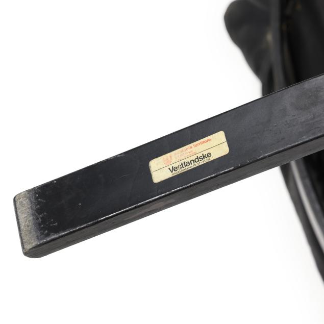 Circa 1960, for Westnofa, ebonized bent wood frame with canvas and cord support, black leather cushions, labeled.