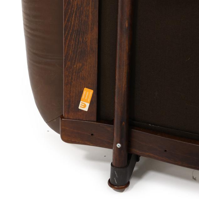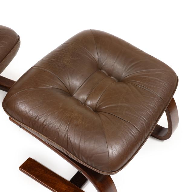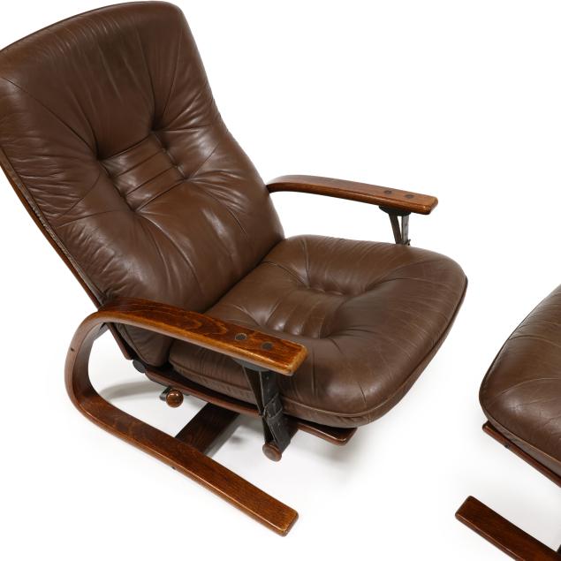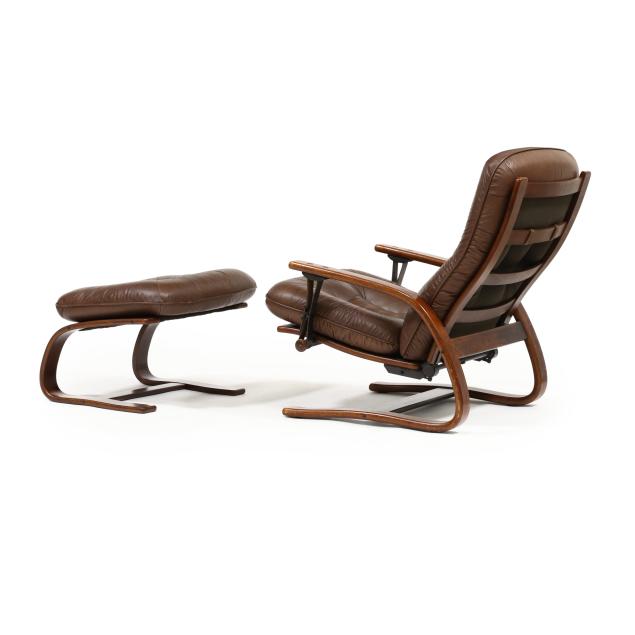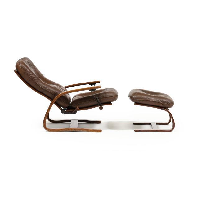 Designed 1955, for Westnofa, brown leather, laminated bent wood frames, adjustable back chair, leather strap and buckle arm supports, with conforming cantilevered ottoman, labeled.