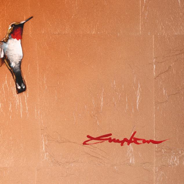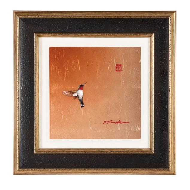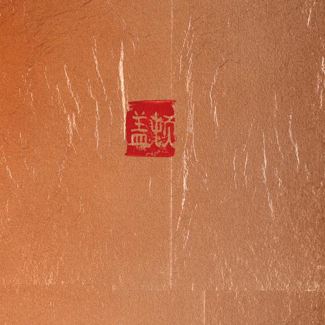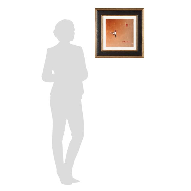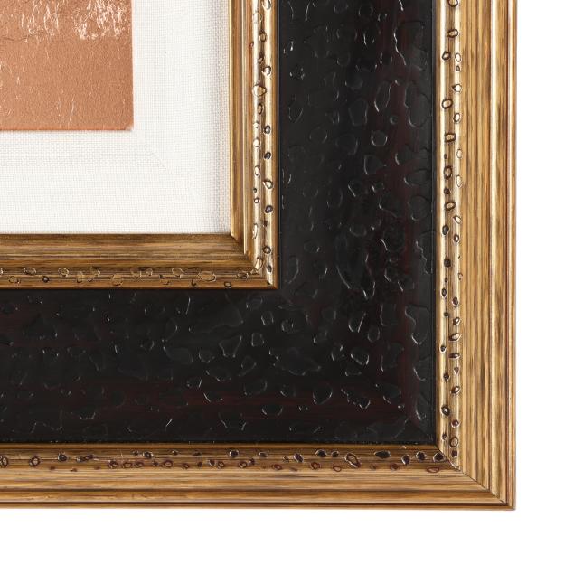 Acrylic and hand veined gold leaf on aluminum, signed at lower right, retaining gallery label to verso and paperwork, presented in a parcel gilt frame.