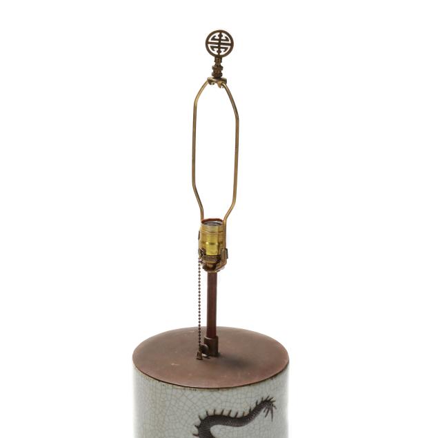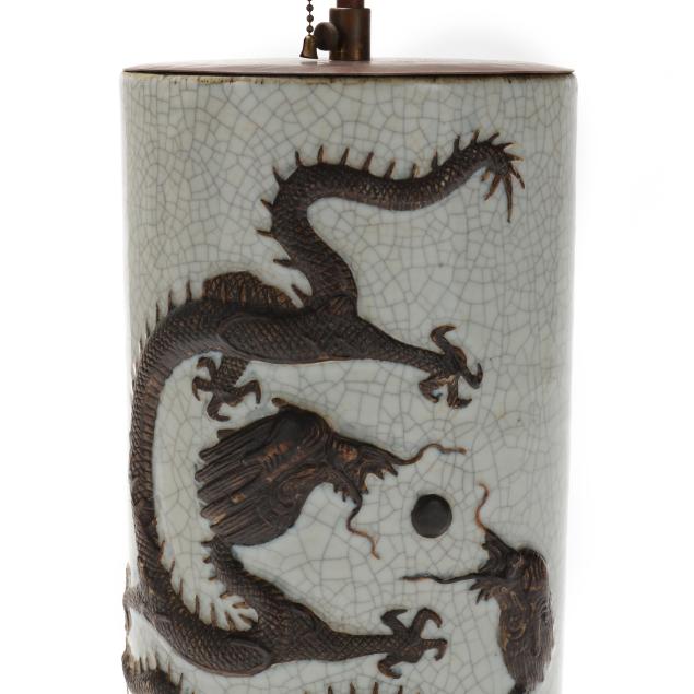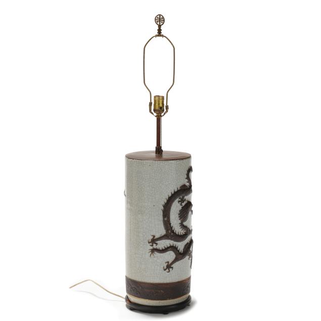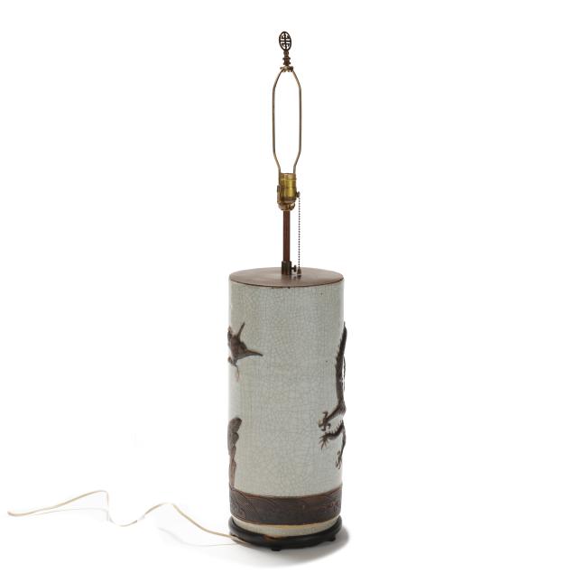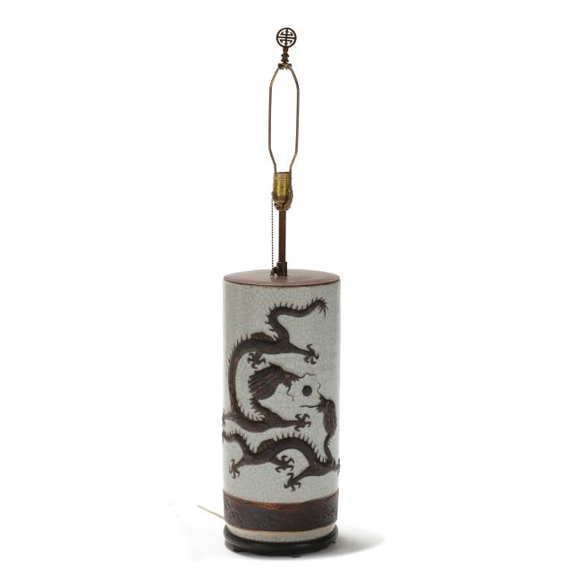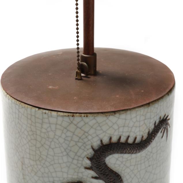 Mid to late 20th century, a porcelain crackle vase with relief dragons and incised banded base, now electrified as single socket lamp with carved wood base, includes silk lined shade.
