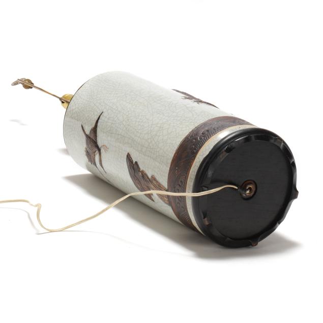 From the Estate of the late Jean Bainbridge, Halifax, Virginia Working at time of evaluation; vase not examined outside of mount; chip to wood base; a few scuffs to base of vase.